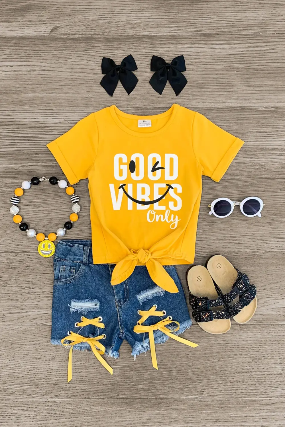 Your sweet little one will look oh-so adorable in our "Good Vibes Only" Mustard Lace Up Denim Short Set. This mustard yellow top with a tie waist looks adorable paired with the distressed denim shorts. The stretch waistband helps comfort and fit and can be great for on the go, while the matching lace-up details add edgy flair. The top and shorts can be worn as a set and paired with our matching or keep it laid back with a , she’ll shine bright in this kids ensemble.