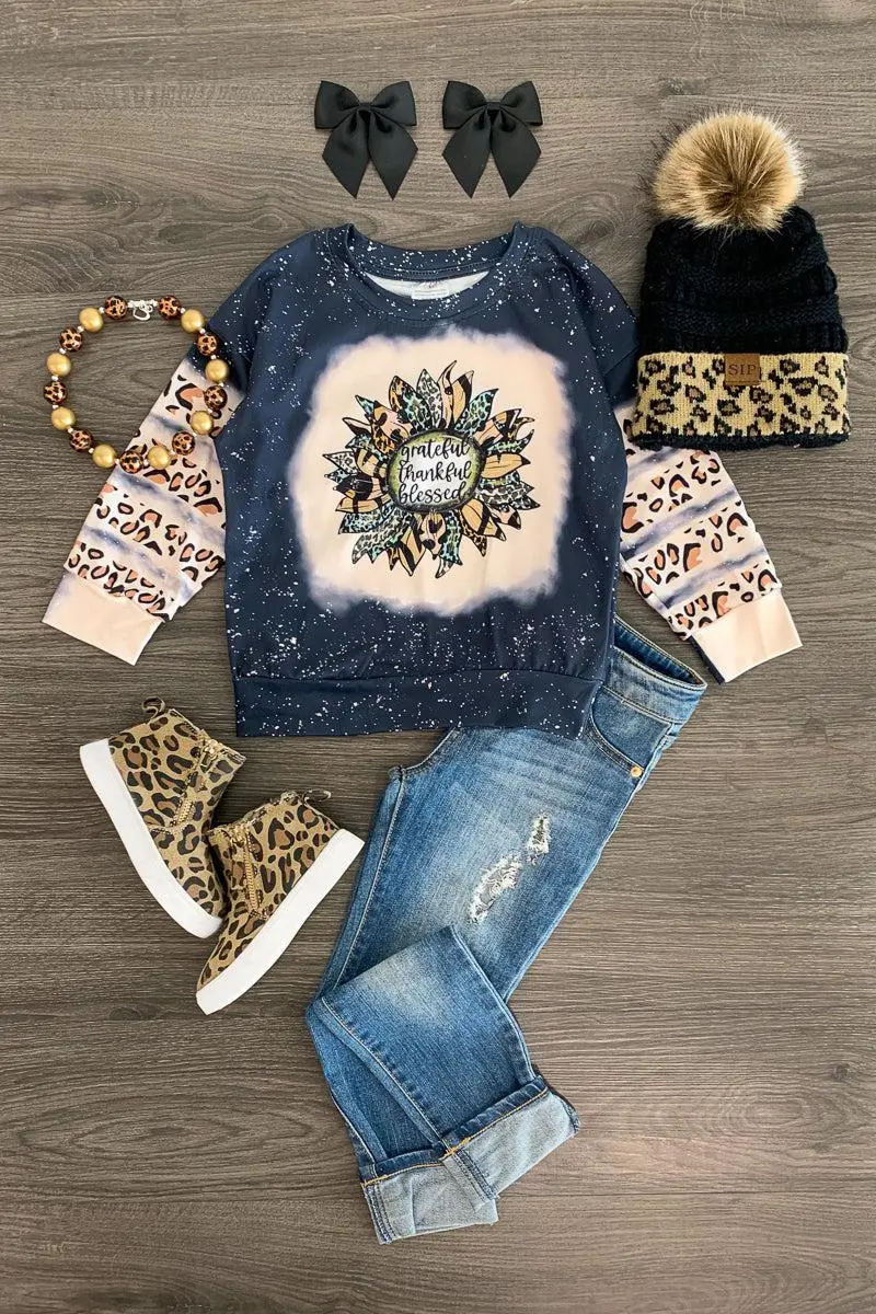 Your gal will love the comfort and cool style this "Grateful Thankful Blessed" Leopard Sunflower Top brings to her Thanksgiving wardrobe. This top features a navy & cream design with leopard accents. Made from soft, breathable fabric, this girls' top feels cozy against her skin making it a perfect pick all season long. Pair this top with our matching or for the perfect look!