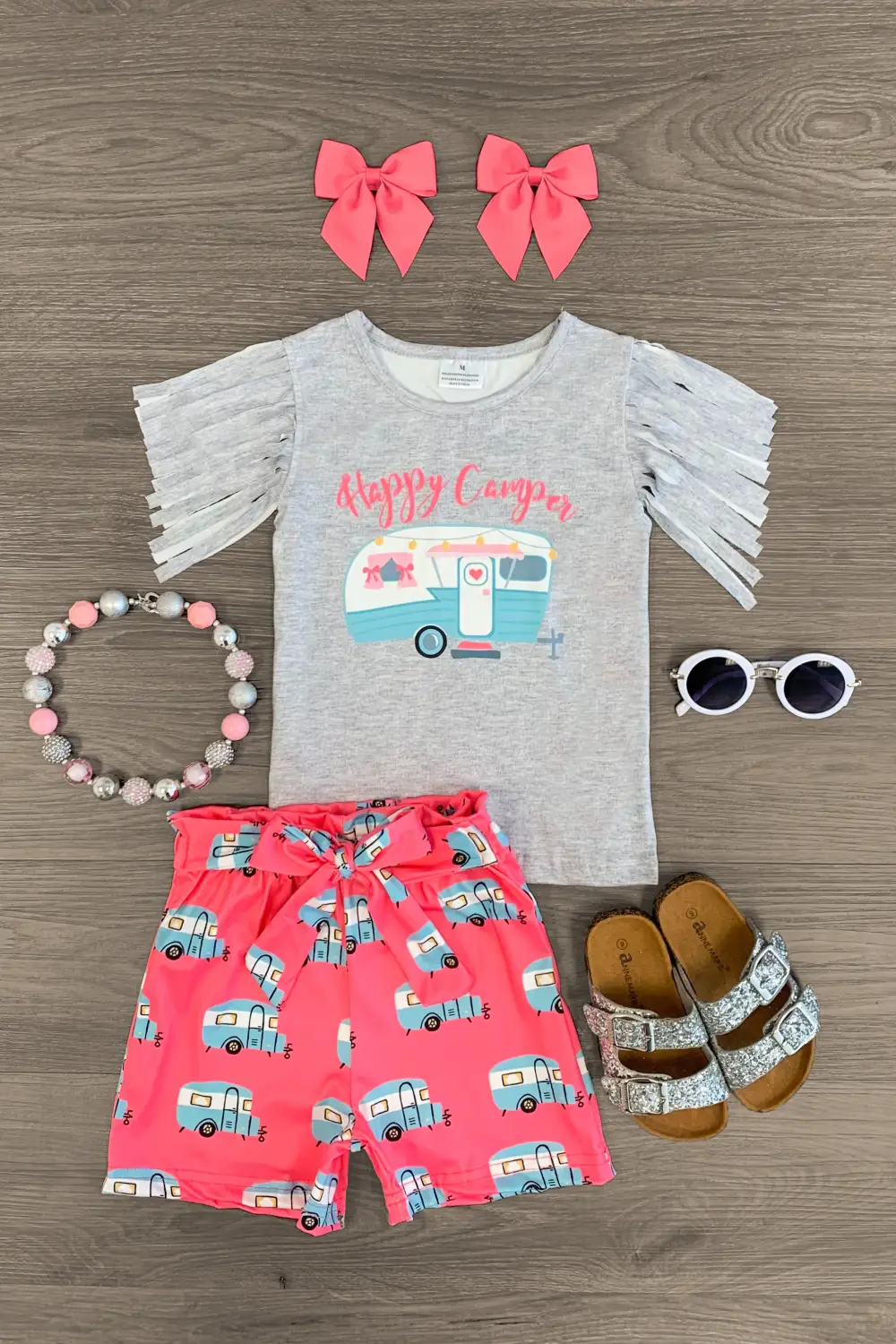 Your sweet little one will look oh-so adorable in our "Happy Camper" Pink Fringe Short Set for girls. This fringe-detail top looks adorable paired with the matching tie waist shorts. The stretchy waistband helps comfort and fit and can be great for on the go, while the pink camper print adds the cutest touch. The top and shorts can be worn as a set and paired with our matching or keep it laid back with our , she’ll shine bright in this kids ensemble.