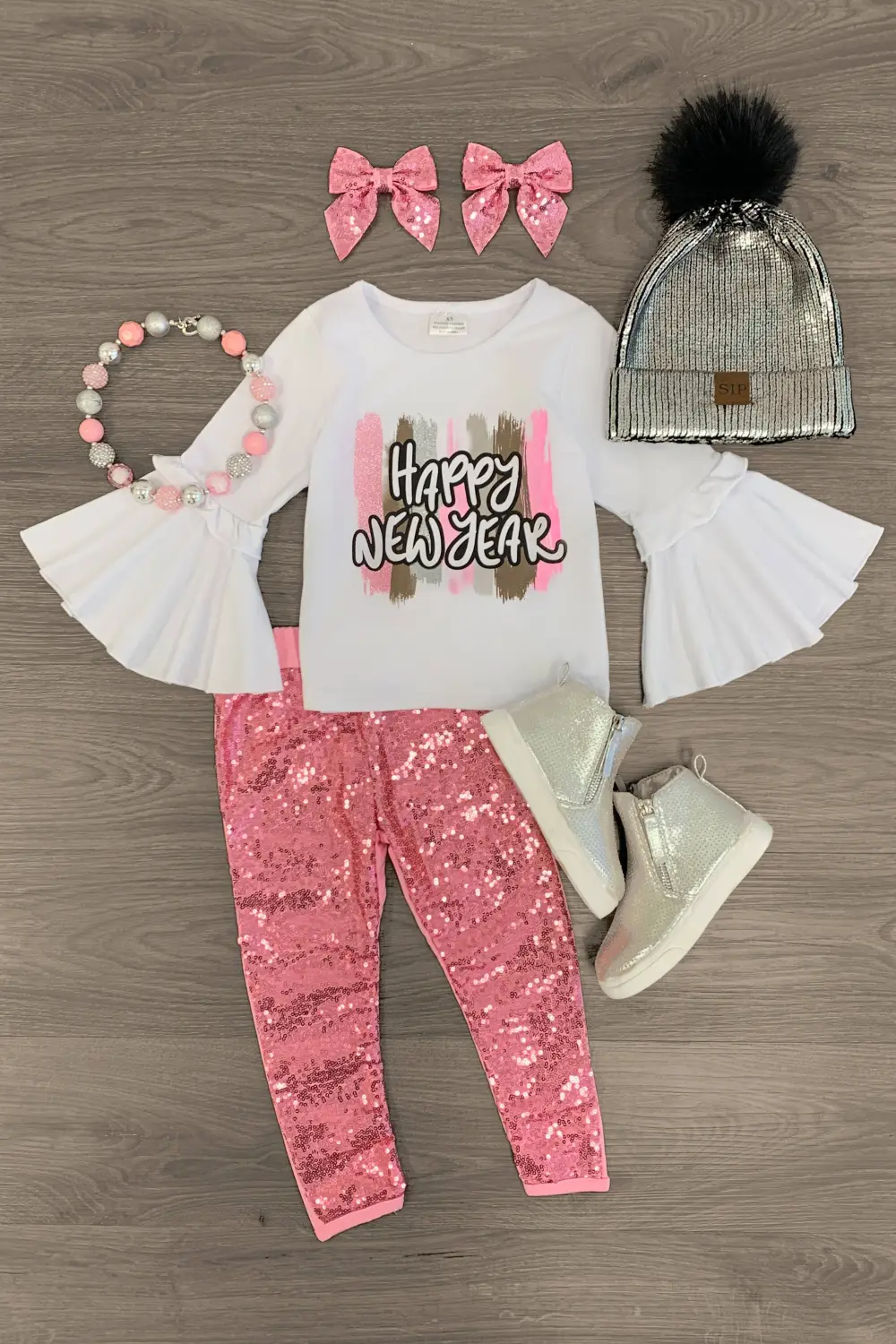 Ring in the New Year with our "Happy New Year" Pink Sequin Pant Set for girls. This bell sleeve top looks adorable paired with sequin-front bottoms. The long sleeves keeps your little one cozy and looking like a dream, while the adorable pink design adds the perfect pop of color. The top and bottoms can be worn as a set and paired with our or keep it laid back with matching , she’ll shine bright in this kids ensemble.