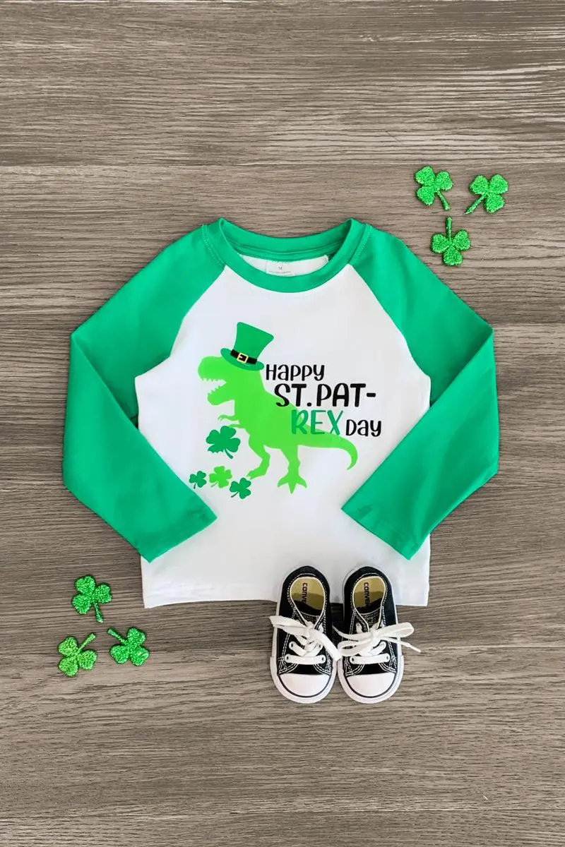 - White bodice with green sleeves & "Happy St. Pat-Rex Day" on the front