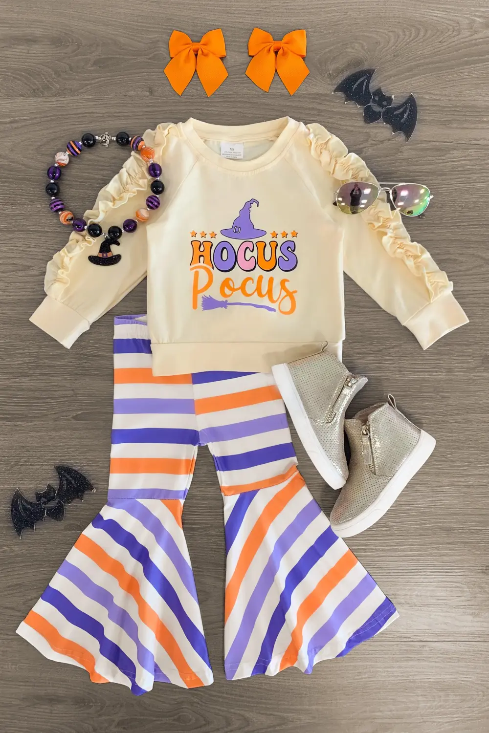 Bring on spooky season with this "Hocus Pocus" Striped Bell Bottom Set for girls. The top features ruffle detailed sleeves with a cute "Hocus Pocus" design embossed on the front and looks adorable paired with the matching bell bottoms. The adjustable waistband helps comfort and fit and can be great for on the go, while the stripes add a fun touch. The top and pants can be worn as a set and paired with our matching or keep it laid back with a matching , she’ll shine bright in this kids ensemble.