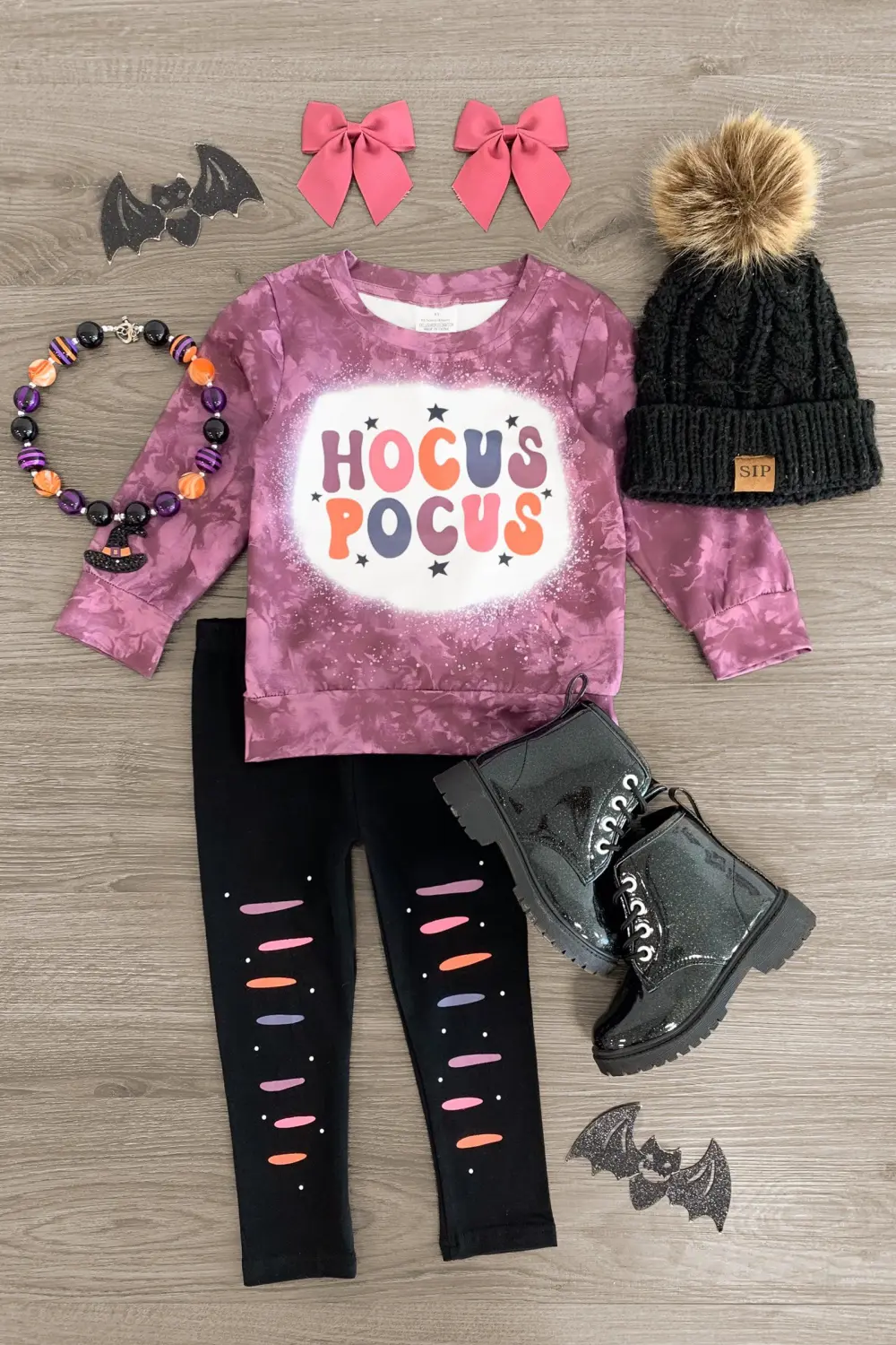 Bring on spooky season with this "Hocus Pocus" Purple Legging Set for girls. This set is styled with a purple long sleeve top that features a witchy design on the front and looks adorable paired with the matching leggings. The stretch waistband provides a secure fit and allows for all day comfort, while the faux distressing adds a fun touch. She can pair this set with or our fun for the perfect Halloween look!
