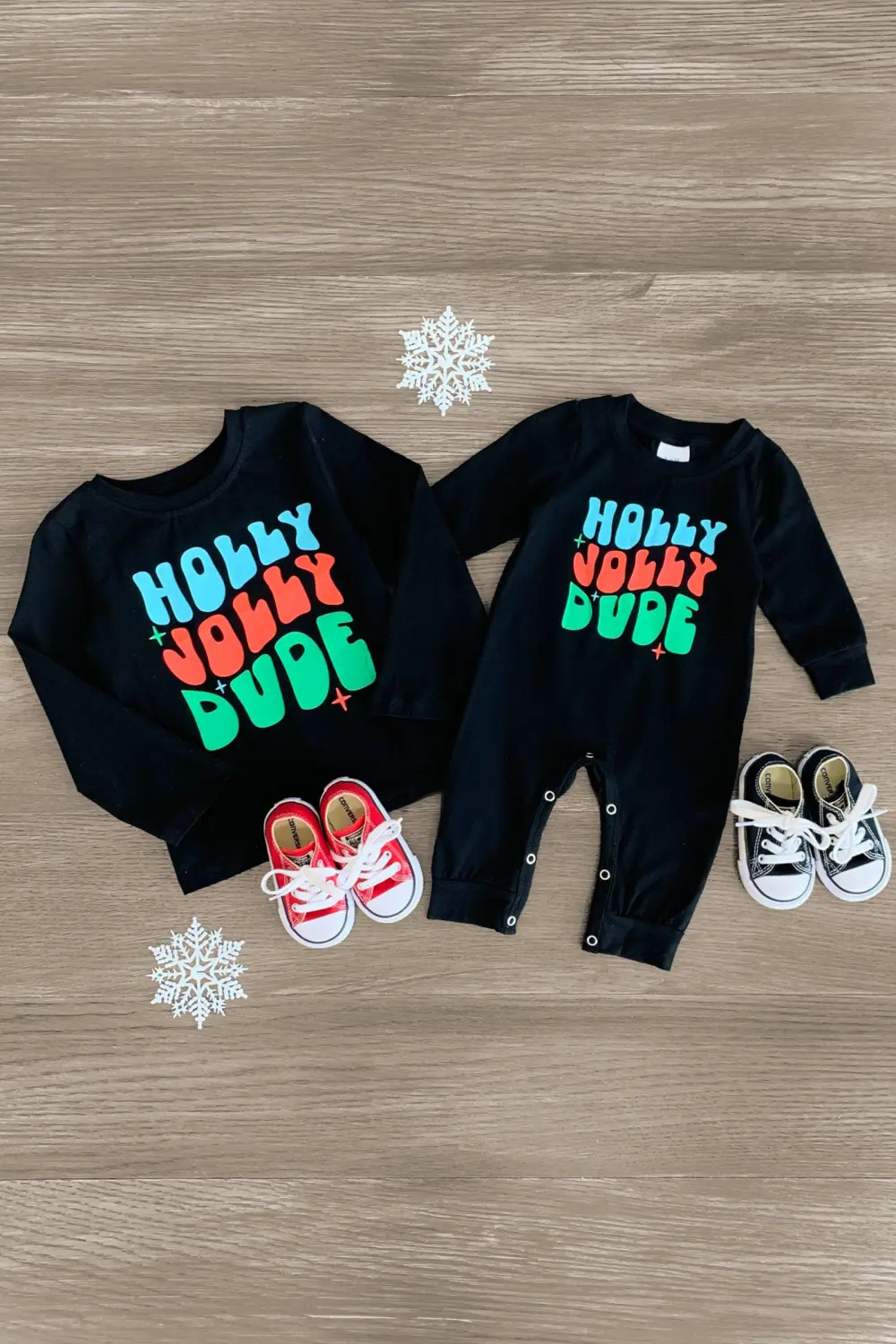 This "Holly Jolly Dude" Long Sleeve Top & Romper features a solid black design with a fun saying embossed on the front. This adorable & festive shirt is great for Christmas at home or out and about! This top & romper is made from soft and breathable fabric that will keep your little one comfy during all adventures. Pair this adorable kids piece with a variety of bottoms for the perfect look! Check out our for more looks like this one!
