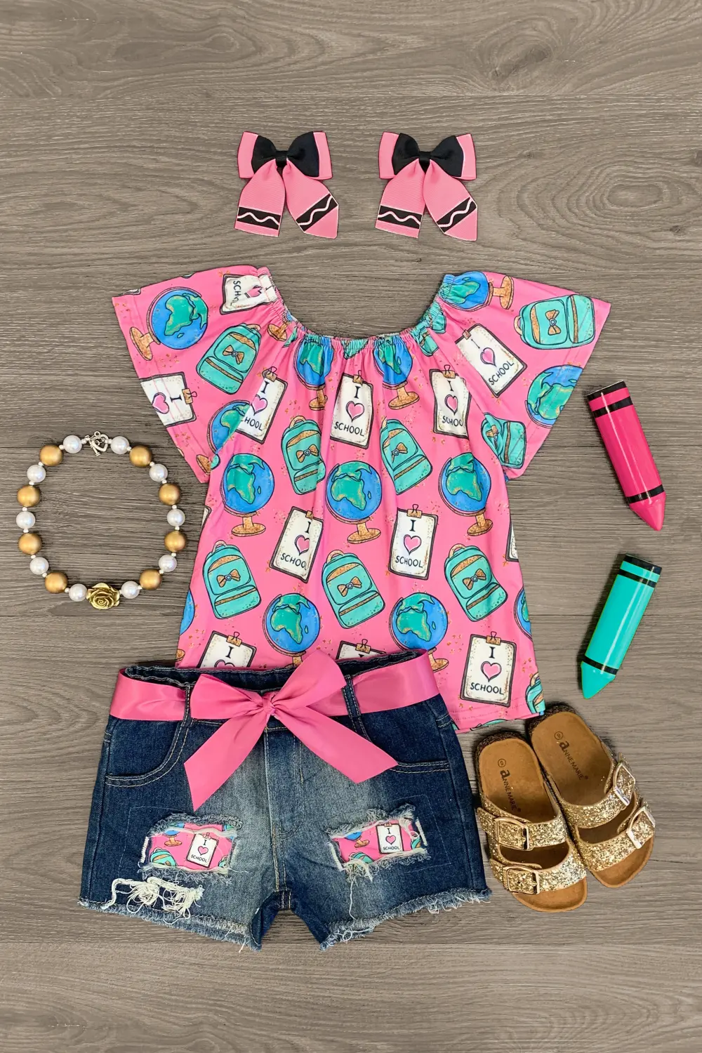 Add sweet fluttery style to her look with this "I Love School" Pink Denim Short Set. This girls' set is styled with a simple cinch neckline colorful school print top making it a staple addition to her everyday wear. The top is paired with denim shorts with an adjustable waistband for the perfect fit all day long. She can pair this set with or a matching for the perfect school look!