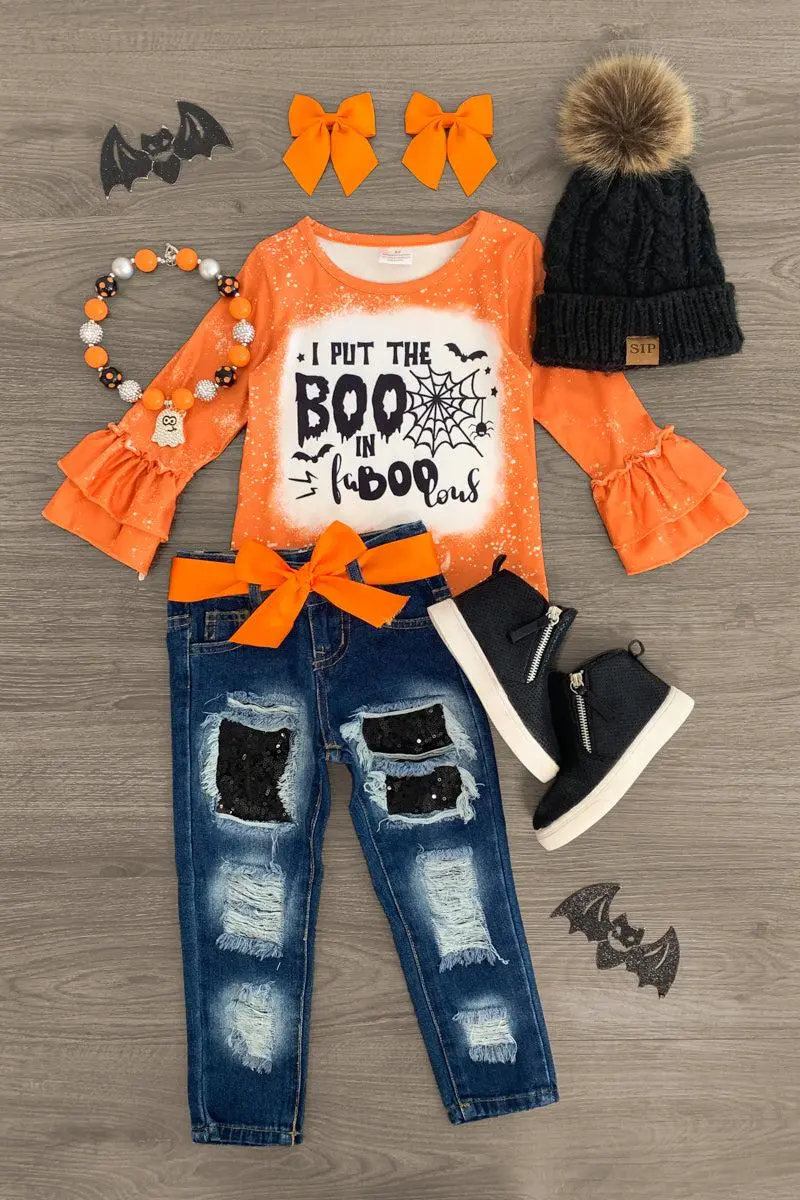Add spooky style to your little boo's wardrobe with our "I Put The Boo In FaBOOlous" Sequin Denim Set for girls. This top features a crew neckline and a cute saying on the front and looks adorable paired with the distressed denim jeans. The adjustable waistband helps comfort and fit and can be great for on the go while the sequin details add fun flair. The top and pants can be paired with our matching or dress it up with a , she’ll shine bright in this kids ensemble.