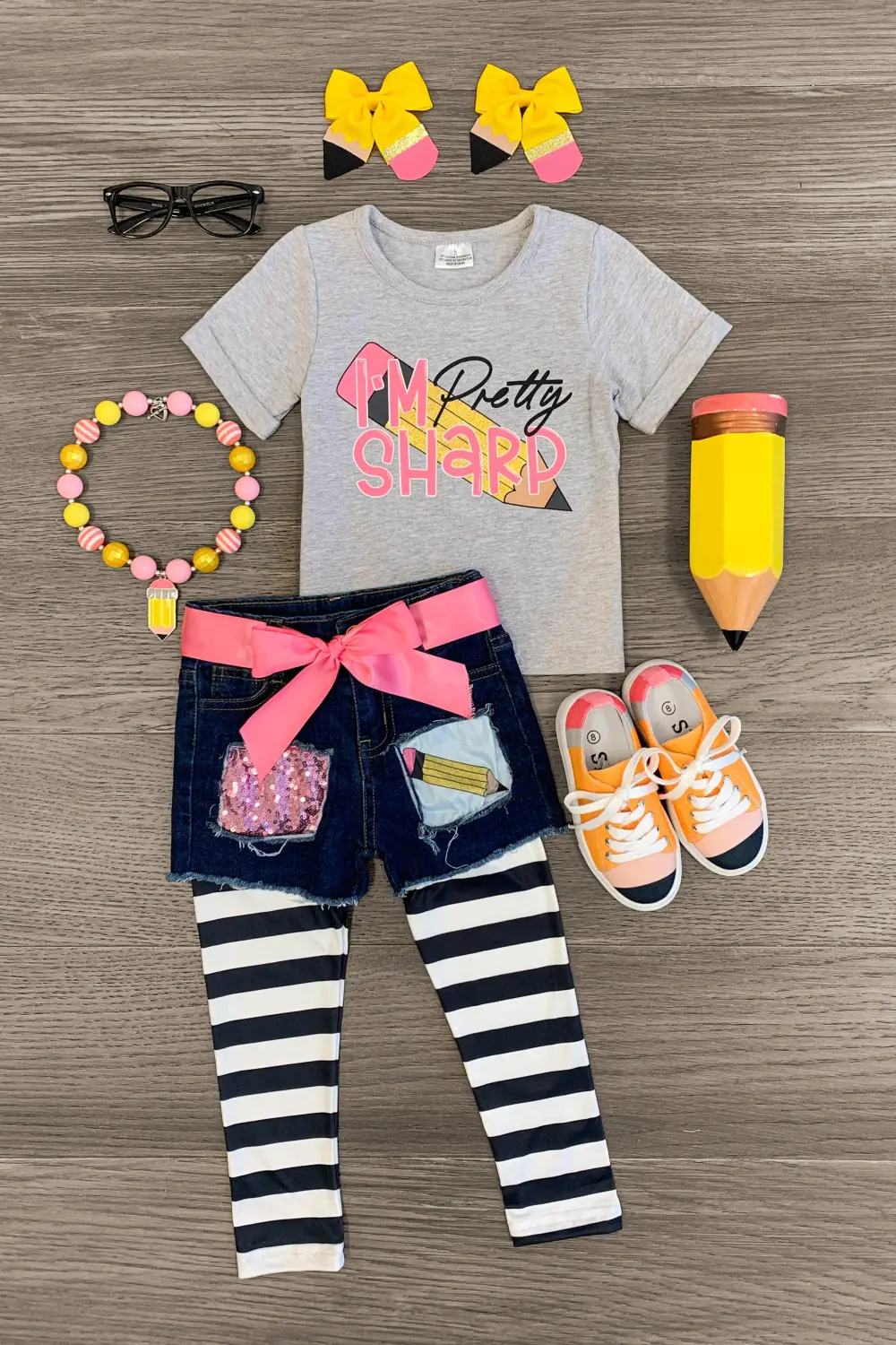 Bring on days in the classroom with this "I'm Pretty Sharp" Legging & Denim Short Set for girls. This short sleeve top looks adorable paired with the distressed denim shorts & striped leggings. The stretchy waistband helps comfort and fit and can be great for on the go. The top, shorts, and leggings can be worn as a set and paired with our SIP or keep it laid back with a pair of , she’ll shine bright in this kids ensemble.