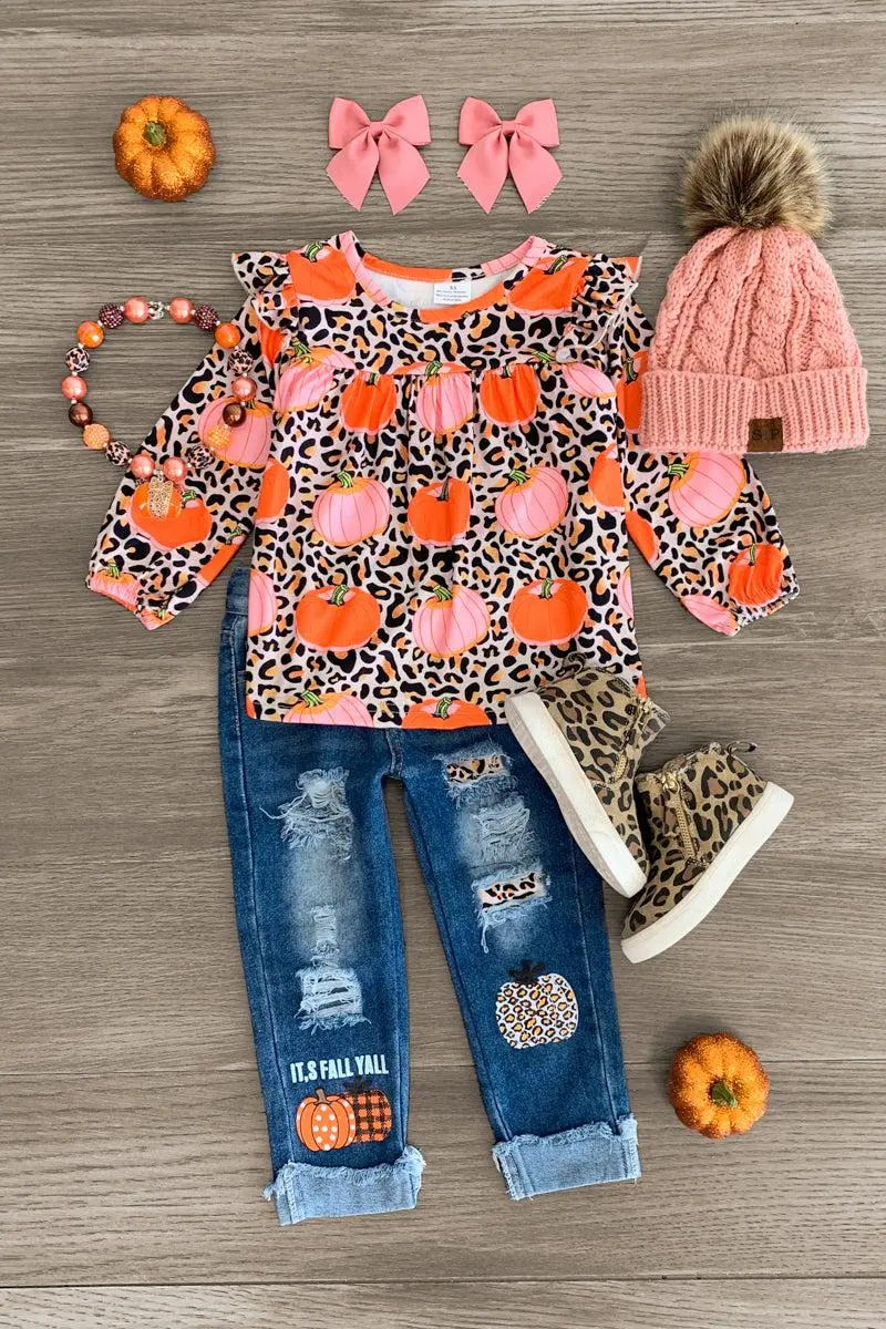 Get ready for fall with this adorable "It's Fall Y'all" Leopard Pumpkin Denim Pant Set for girls. This pumpkin print top looks adorable paired with the distressed denim jeans. The adjustable waistband helps comfort and fit and can be great for on the go, while the "It's Fall Y'all" details adds the perfect fun touch. The top and pants can be worn as a set and paired with our SIP or keep it laid back with a pair of . She’ll be sure to shine bright in this kids ensemble!