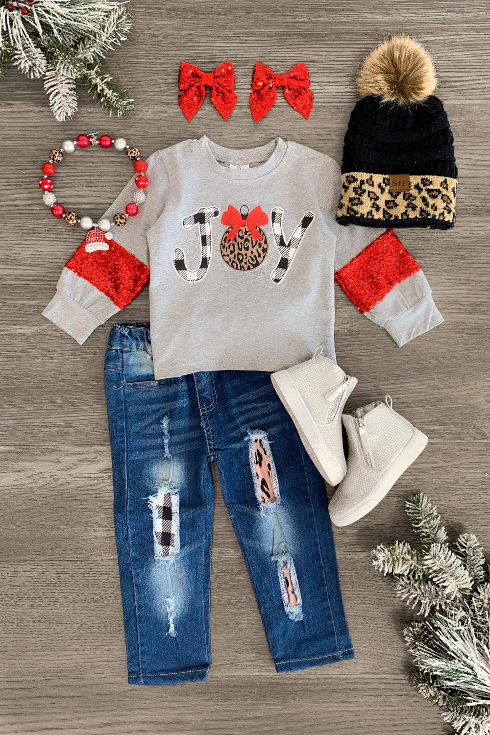 Bring on the holiday season with our "Joy" Leopard & Plaid Distressed Denim Pant Set for girls. This heather gray top with sequin-detailed sleeves looks adorable paired with the distressed denim pants. The adjustable waistband helps comfort and fit and can be great for on the go, while the long sleeves keeps your little one cozy and looking like a dream. The top and pants can be worn as a set and paired with our or keep it laid back with a matching , she’ll shine bright this Holiday season.