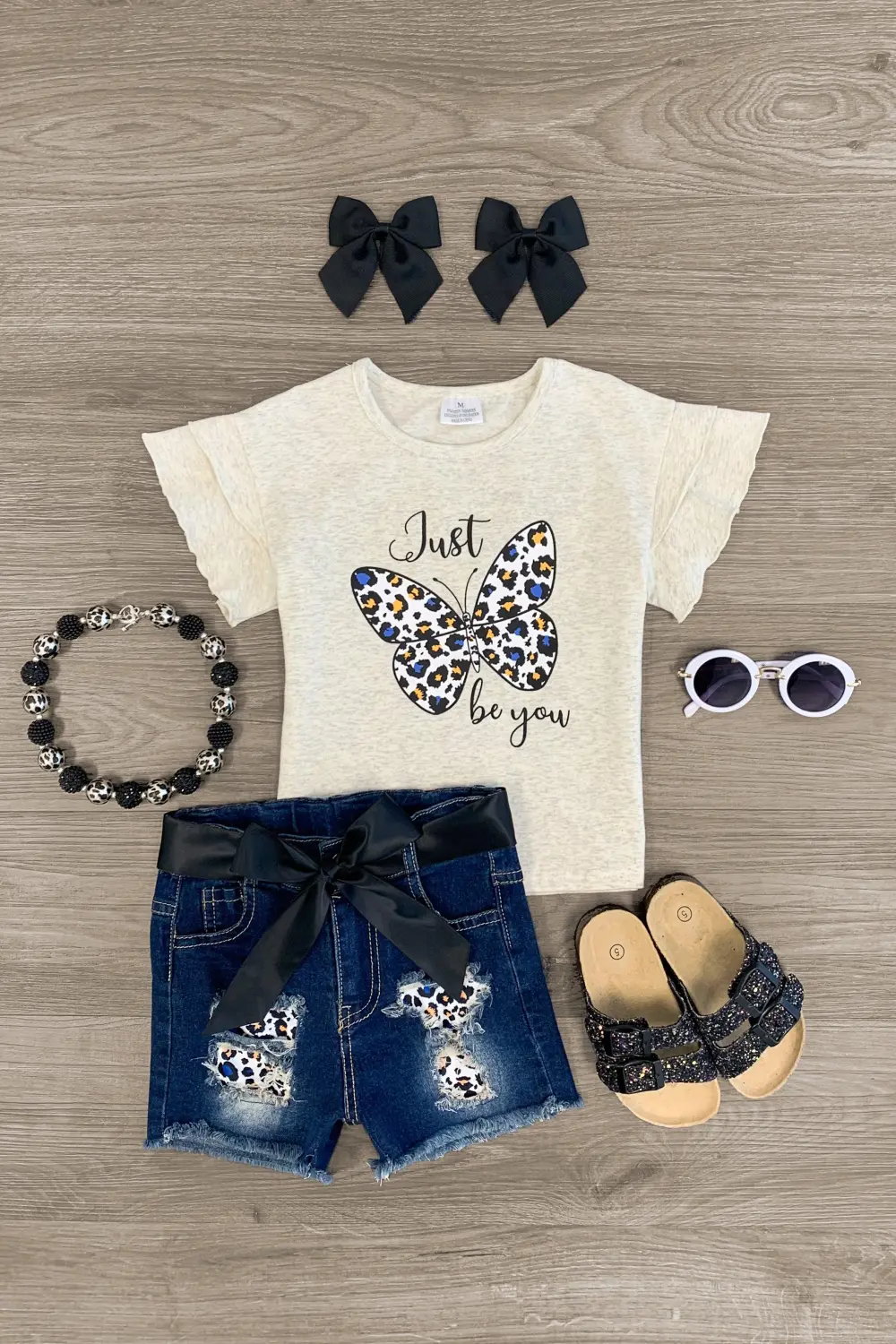 Bring on springtime with this "Just Be You" Leopard Butterfly Denim Short Set for girls. This heather cream top looks adorable paired with the matching denim shorts. The adjustable waistband helps comfort and fit and can be great for on the go, while the matching peekaboo cheetah details add a fun touch to her look. The top and shorts can be worn as a set and paired with our matching or keep it laid back with a pair of , she’ll shine bright in this kids ensemble.