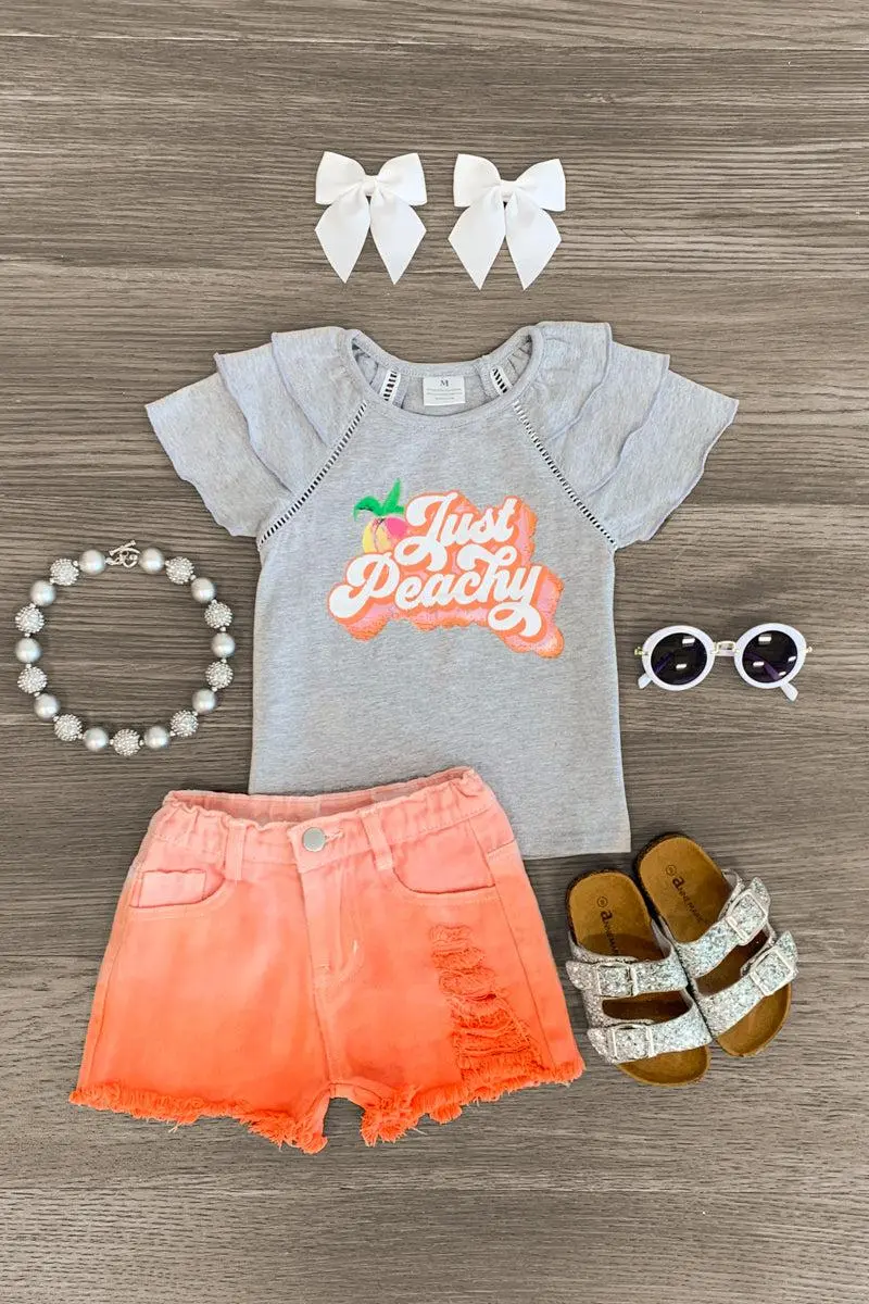 Bring on the warmer weather with this "Just Peachy" Ombre Denim Short Set for girls. The ruffle sleeve top features a fun design on the front and looks adorable paired with the matching orange ombre denim shorts. The adjustable waistband helps comfort and fit and can be great for on the go, while the distressing adds a fun touch to her look. The set can be paired with our cute and a pair of for the perfect look!