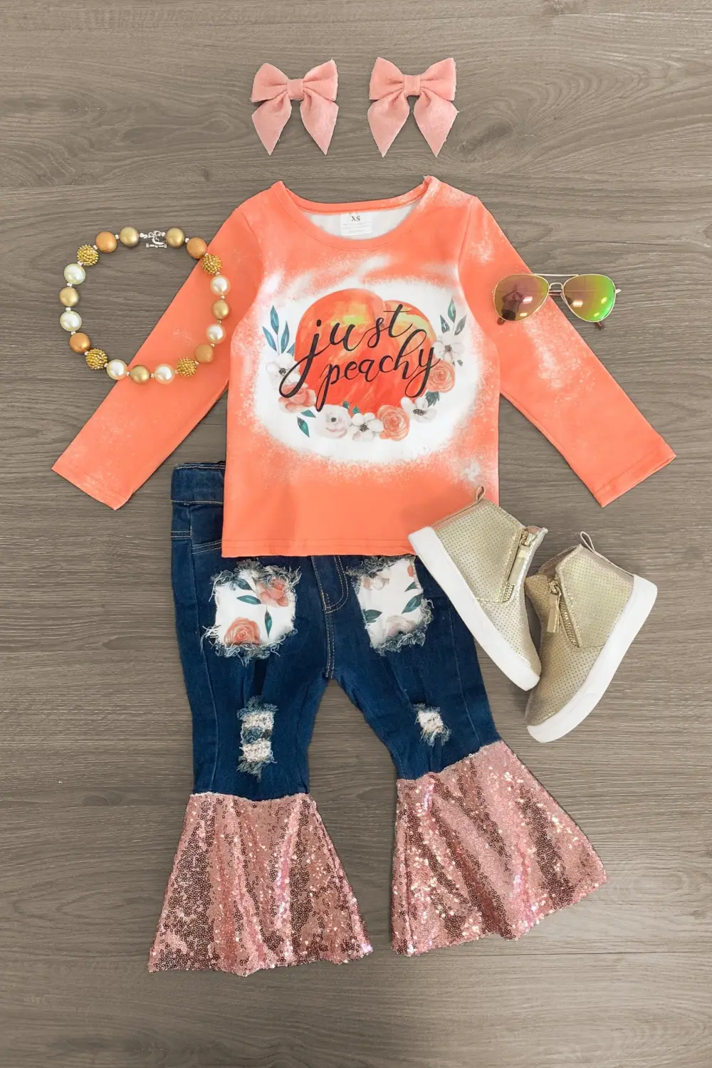 Bring on fall with this "Just Peachy" Sequin Denim Bell Bottom Set for girls. This long sleeve top looks adorable paired with the denim & sequin bell bottoms. The adjustable waistband helps comfort and fit and can be great for on the go. The top and pants can be worn as a set and paired with our SIP or keep it laid back with a pair of , she’ll shine bright in this kids ensemble.