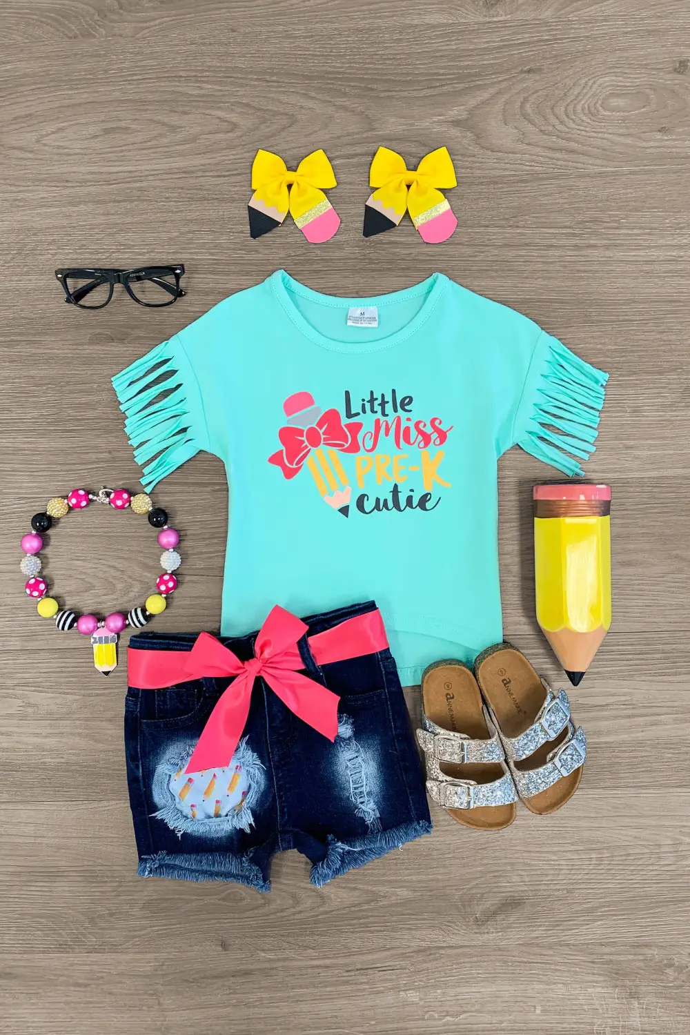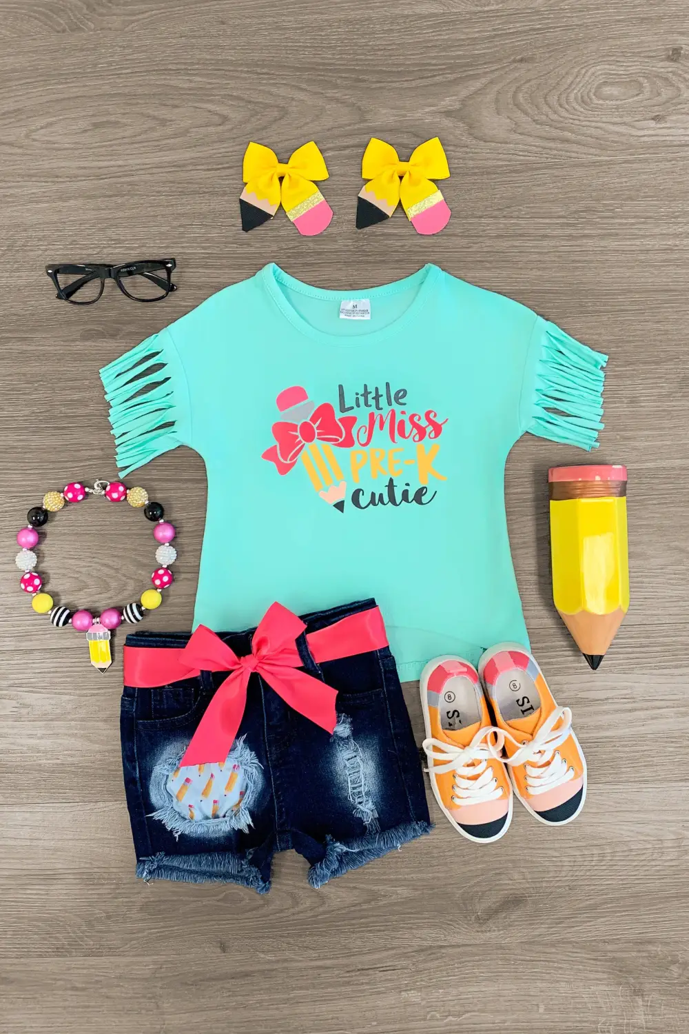 Your sweet little one will look oh-so adorable in our "Little Miss Pre-K Cutie" Distressed Denim Short Set for girls. This mint top features a cute saying on the front as well as decorative tie shoulders. This tank looks adorable paired with the distressed denim shorts. The adjustable waistband & ribbon belt helps comfort and fit and can be great for on the go. The top and shorts can be worn as a set and paired with our matching or keep it laid back with our , she’ll shine bright in this kids ensemble.