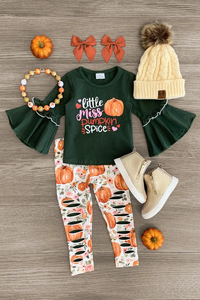 Bring on fall with this "Little Miss Pumpkin Spice" Floral Legging Set for girls. The forest green bell sleeve top features a cute saying on the front and looks adorable paired with the matching pumpkin floral leggings. The stretchy waistband helps comfort and fit and can be great for on the go. The top and leggings can be worn as a set and paired with our matching or keep it laid back with a pair of for the perfect look!