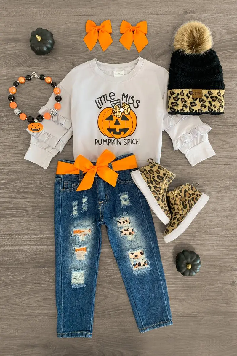 Bring on fall with this "Little Miss Pumpkin Spice" Sequin Denim Pant Set for girls. This top features ruffle detailed long sleeves and a cute pumpkin design on the front that looks adorable paired with the distressed jeans. The adjustable waistband & ribbon belt helps comfort and fit and can be great for on the go. The top and pants can be worn as a set and paired with our matching or keep it laid back with a cute for the perfect Halloween look!