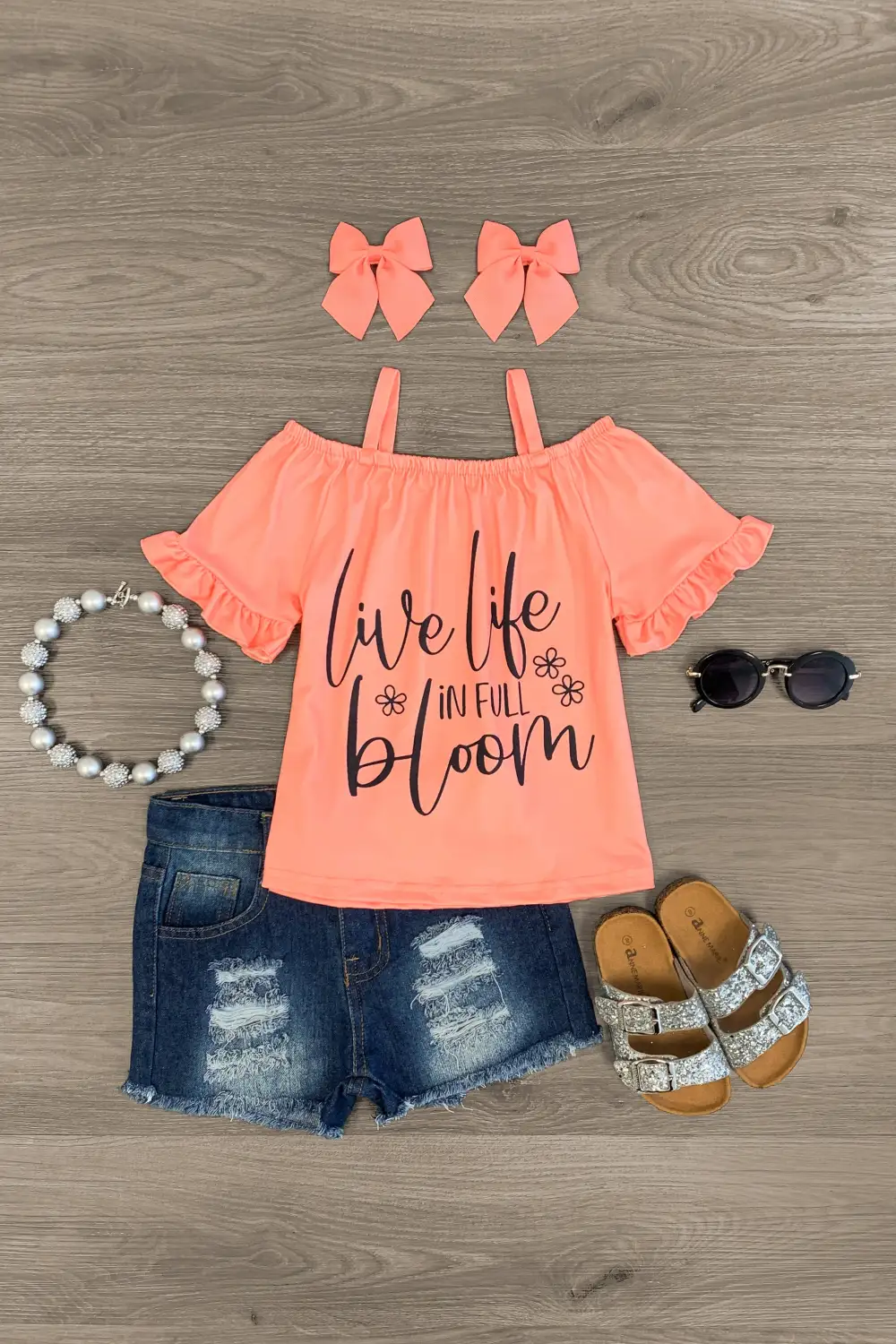 Your little one will look oh-so cute this season with this "Live Life In Full Bloom" Distressed Denim Short Set. This girls' set features a simple cold shoulder top with a cute saying on the front, making it a staple addition to her everyday wear. Paired with matching distressed denim shorts, the ultra-soft fabric makes for comfy all-day wear. She can pair this outfit with or a matching for the perfect look!