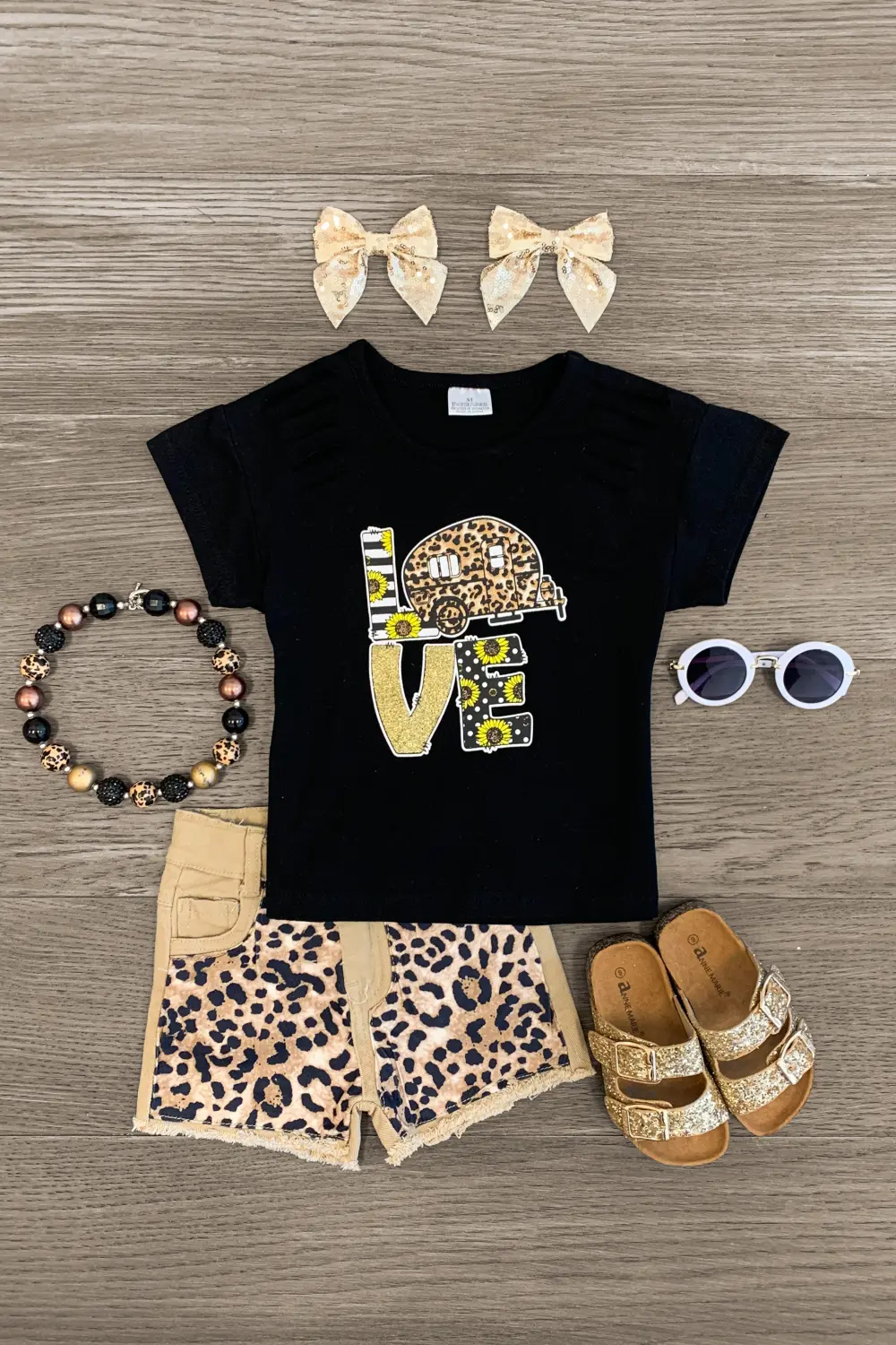 Bring on camping season with this "Love" Cheetah Camper Denim Short Set for girls. This top features a cute saying on the front and looks adorable paired with the matching khaki-colored denim shorts. The adjustable waistband helps comfort and fit and can be great for on the go, while the cheetah details add a fun touch to her look. The top and shorts can be worn as a set and paired with our matching or keep it laid back with a pair of , she’ll shine bright all season at the campground.