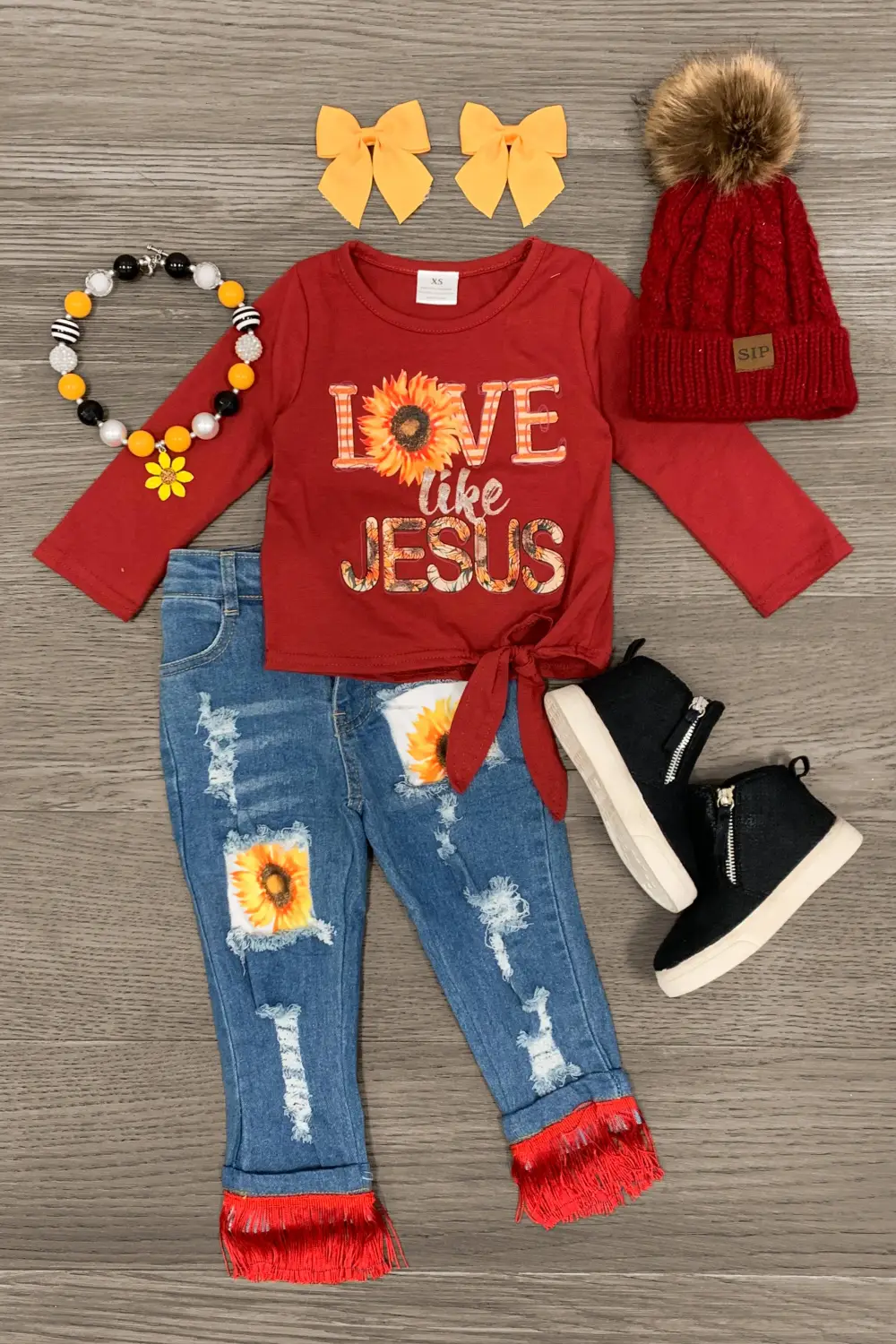 Stay stylish all season in our "Love Like Jesus" Sunflower Fringe Denim Set for girls. This long sleeve top features a cute "Love Like Jesus" sunflower design on the front, and looks adorable paired with the matching distressed denim pants with fringe details. The top and pants can be worn as a set and paired with our , or dress it up with a cute , she’ll shine bright all year in this kids ensemble.