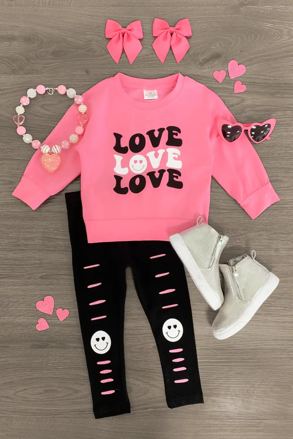 Your little love bug will look adorable in our "Love Love Love" Pink Legging Set. In a versatile long sleeve design, this top pairs perfectly with the matching leggings with printed distressing & smileys. She can pair this set with a variety of SIP & our for an oh-so adorable look. Crafted in a soft stretchy blend and perfect for Valentine's Day, this set is perfect for your little one.