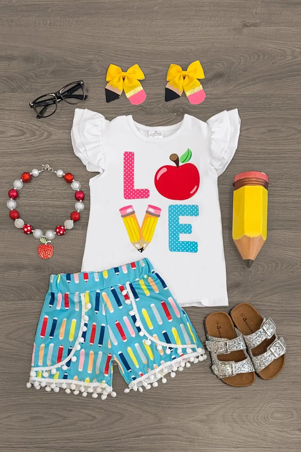 Bring on the school year with this "Love" School Pom Pom Short Set for girls. This crew neck shirt with "Love" written on the front features feminine cap sleeves. This top looks adorable paired with the matching pom pom shorts. The stretchy waistband helps comfort and fit and can be great for on the go. The top and shorts can be worn as a set and paired with our fun school or keep it laid back with a , she’ll shine bright in this kids ensemble.