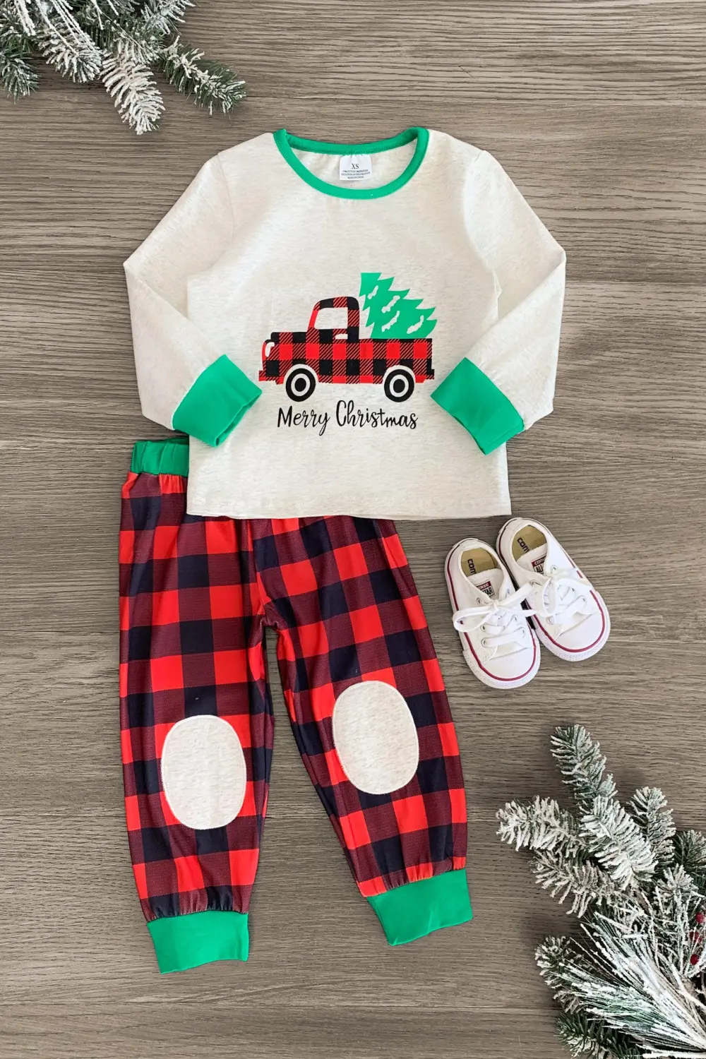 Bedtime just got a whole lot more cozy with this "Merry Christmas" Tree & Truck Plaid Pajama Set for girls. Featuring a cute vintage truck graphic, this set features a long sleeve heather cream top, and is paired with matching plaid bottoms with knee patches. Pair this set with an SIP for the ultimate cozy look!