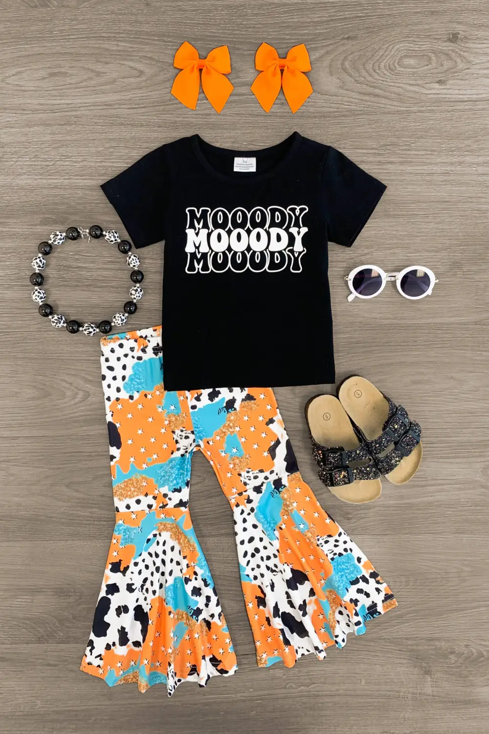 - Girls' set features a black short sleeve top with "Mooody Mooody Mooody" in a retro style