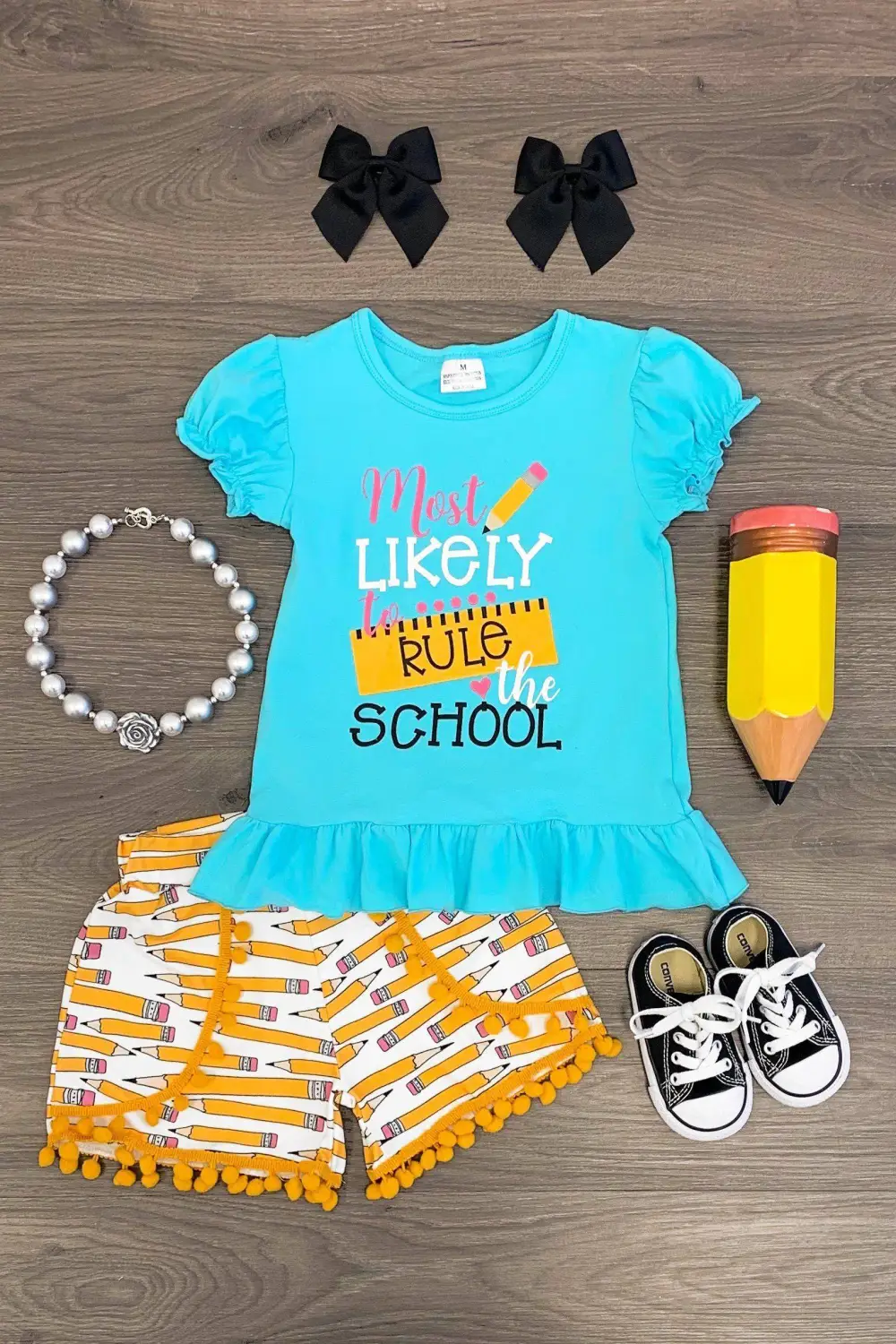 Bring on the school year with this "Most Likely to Rule the School" Pom Pom Short Set. This crew neck shirt with a fun school saying on the front looks adorable paired with the pencil print pom pom shorts. The stretchy waistband helps comfort and fit and can be great for on the go. The top and shorts can be worn as a set and paired with our fun pencil or keep it laid back with a pair of , she’ll shine bright in this kids ensemble.