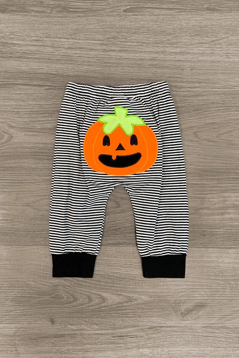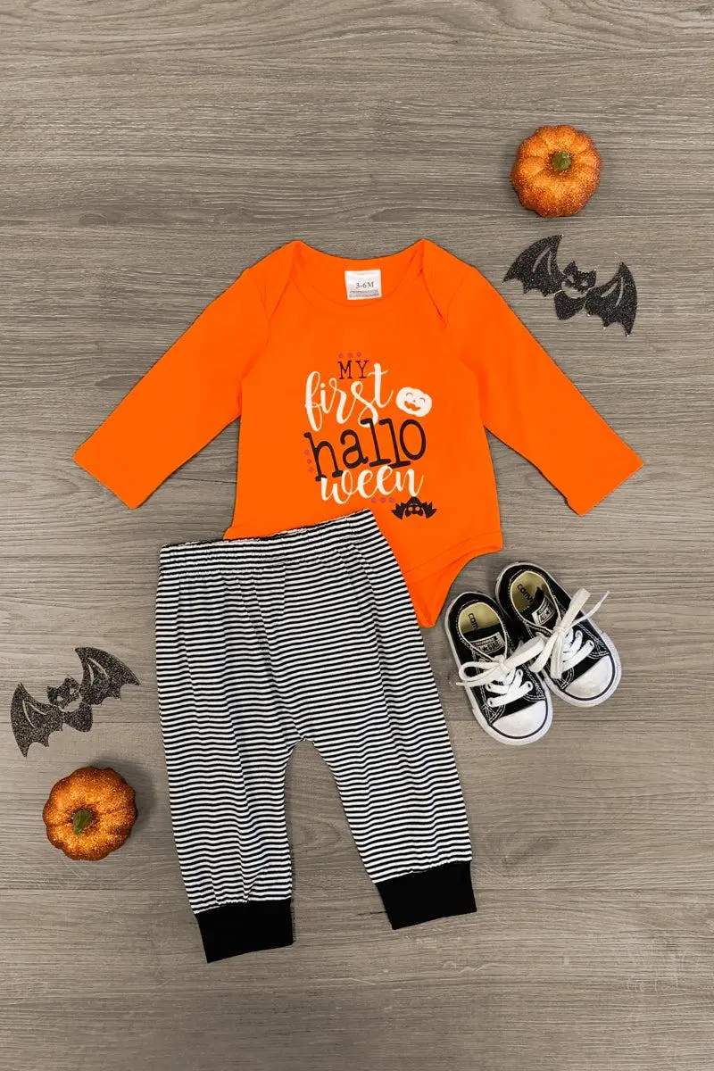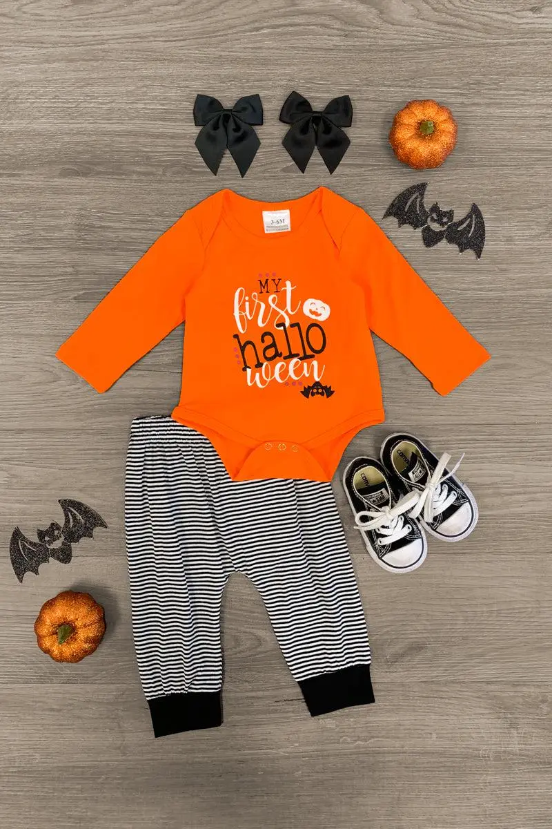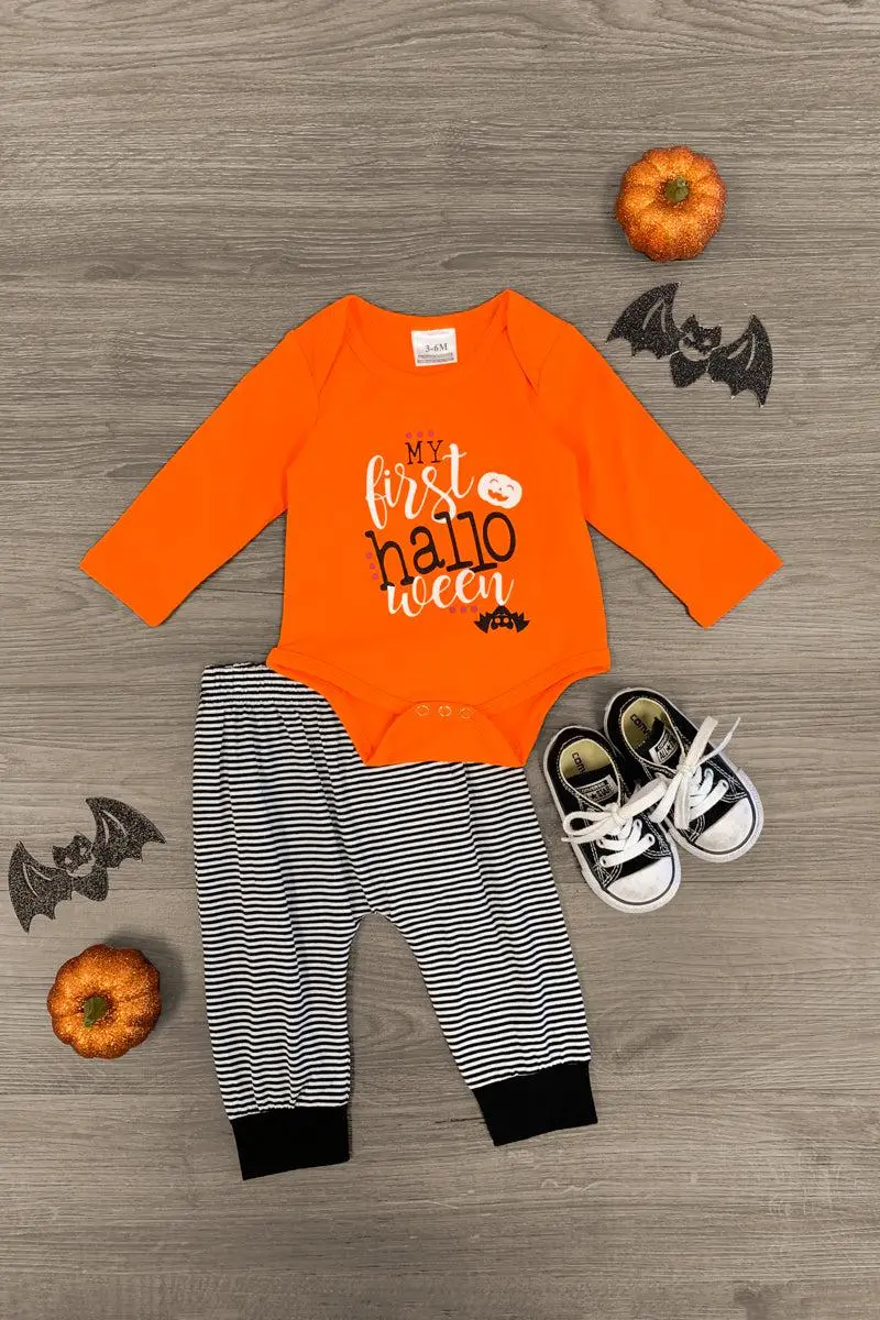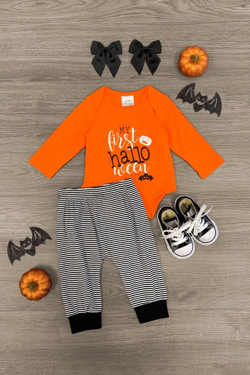 Dress up your little one for spooky season in this "My First Halloween" Onesie Set. This long sleeve onesie is made from soft, stretchy fabric makes a comfortable one-piece for Halloween wear. This onesie features a cute saying on the front, and is paired with matching white and black striped bottoms with a jack-o-lantern on the butt! Check out our for more sets like this one!