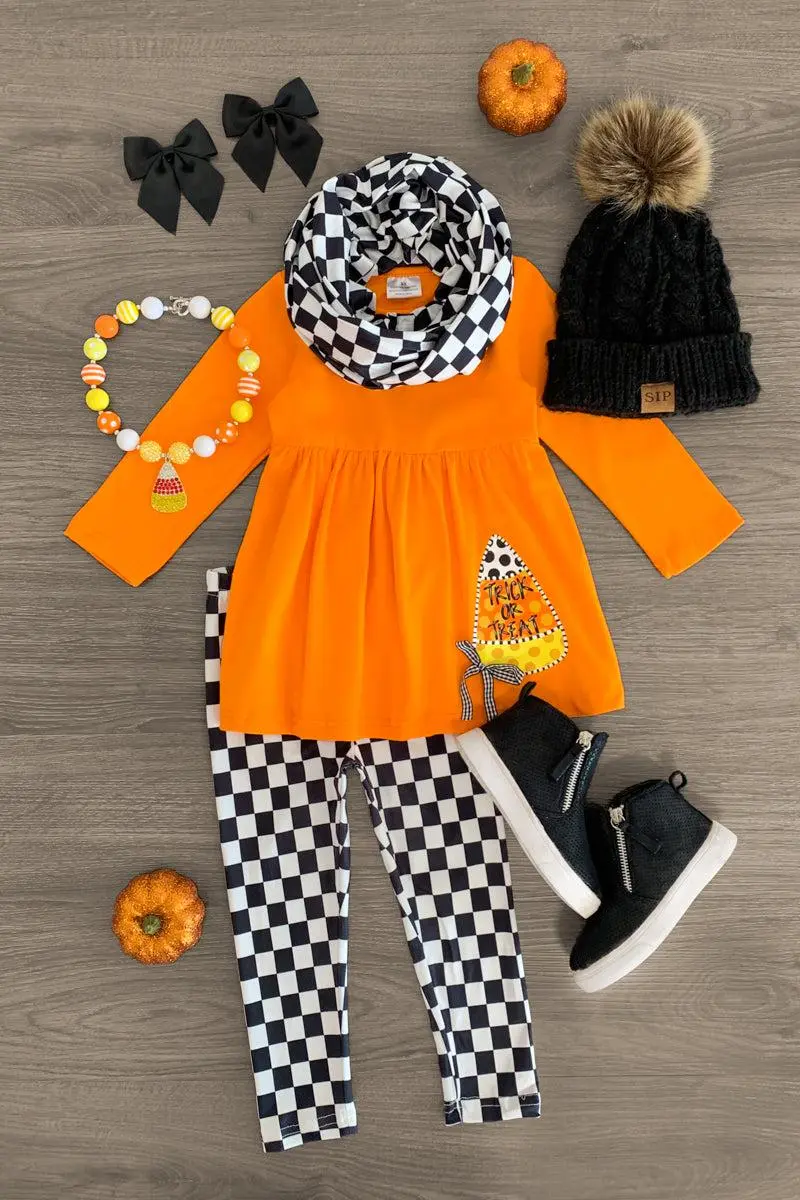 Bring on spooky season with this "Trick or Treat" Checkered Scarf Set for girls. This tunic top features long sleeves and a cute "Trick or Treat" design. This top looks adorable paired with the checkered bottoms & scarf. The stretchy waistband helps comfort and fit and can be great for on the go. The top and pants can be worn as a set and paired with our SIP or keep it laid back with a pair of , she’ll shine bright in this kids ensemble.