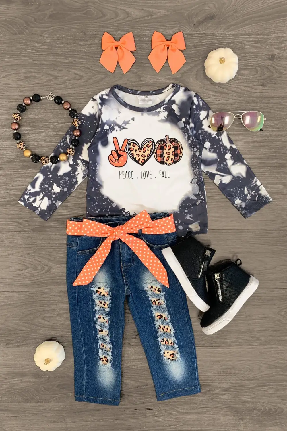 Bring on the cooler days with this "Peace Love Fall" Leopard Pumpkin Denim Pant Set. This long sleeve top features "Peace Love Fall" embossed on the front. This top looks adorable paired with the matching denim jeans. The adjustable waistband helps comfort and fit and can be great for on the go. The top and pants can be worn as a set and paired with our SIP or keep it laid back with a cheetah , she’ll shine bright in this kids ensemble.