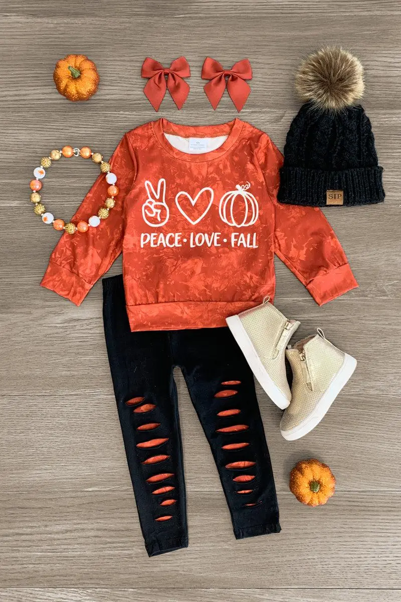 Add sweet fluttery style to her look with this "Peace Love Fall" Rust Distressed Legging Set. This girls' set is styled with a rust orange tie dye print long sleeve top making it a staple addition to her everyday wear. The top is paired with matching peekaboo print distressed leggings. The stretch waistband provides a secure fit and allows for all day comfort. She can pair this set with or our fun for the perfect look!