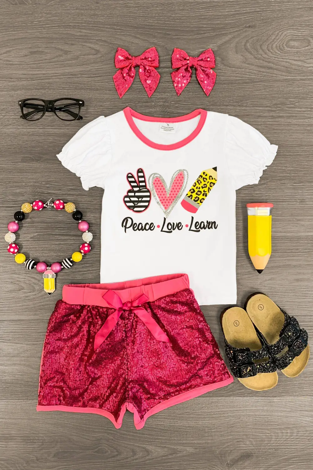 Your little one will look so adorable in this "Peace Love Learn" Pink Sequin Short Set. This girls' set is styled with a white top with short, puff sleeves, making it a staple addition to her back to school wear. The top is paired with pink sequin shorts that feature a stretchy waistband to provide a secure fit. She can pair this set with or our fun SIP for the perfect look!