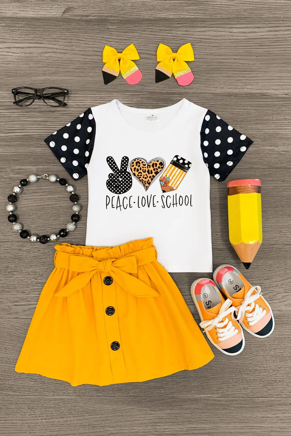 Bring on back to school with this "Peace Love School" Skirt Set for girls. This school themed shirt looks adorable paired with the matching yellow skirt. The stretchy waistband helps comfort and fit and can be great for on the go. The polka dot cap sleeve details keeps your little one cozy and looking like a dream. The top and skirt can be worn as a set and paired with our or keep it laid back with a pair of , she’ll shine bright in this kids ensemble.