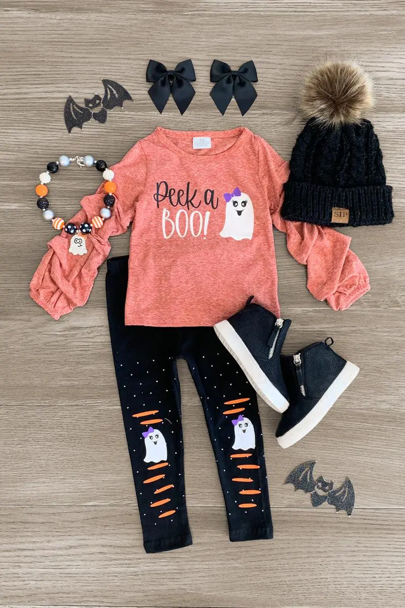 Stay comfy yet cute all season with this "Peek A Boo!" Ghost Legging Set for girls. This long sleeve top looks adorable paired with the black leggings with printed distressed details & ghosts. The stretchy waistband helps comfort and fit and can be great for on the go. The top and leggings can be worn as a set and paired with one of our SIP or keep it laid back with a pair of , she’ll shine bright in this kids ensemble all season.