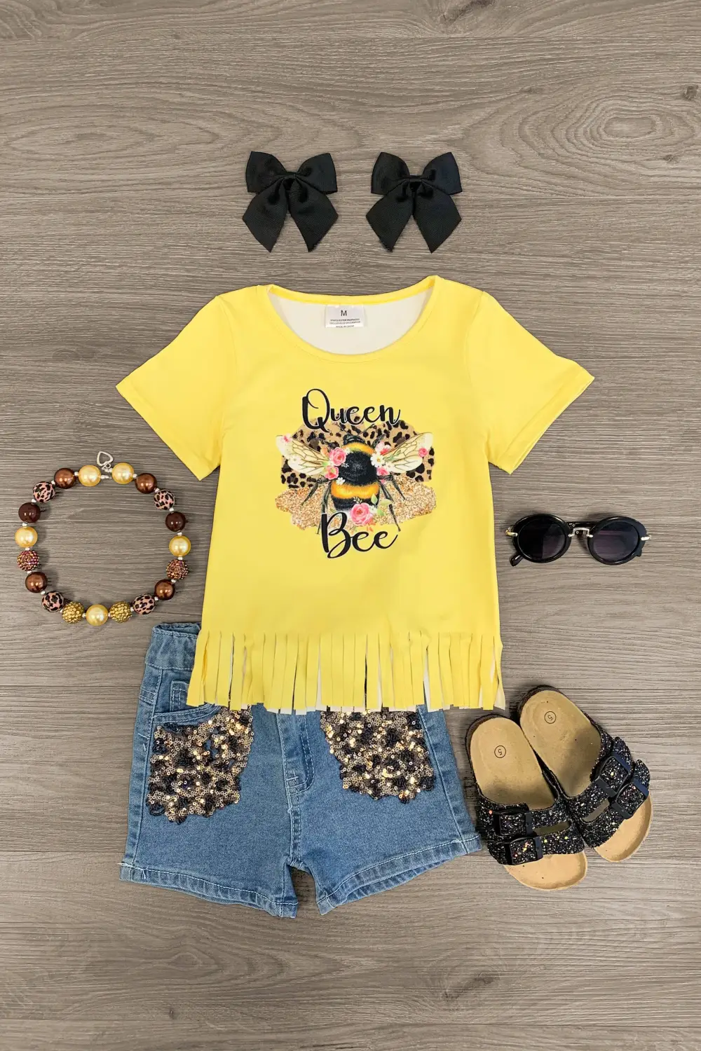 Your little one will look so adorable in our "Queen Bee" Sequin Denim Short Set. This girls' set is styled with a simple short sleeve top with a fringe hem making it a staple addition to her everyday wear. The top is paired with distressed denim shorts that feature sequin details with an adjustable waistband to provide a secure fit. She can pair this set with or our fun SIP for the perfect look!