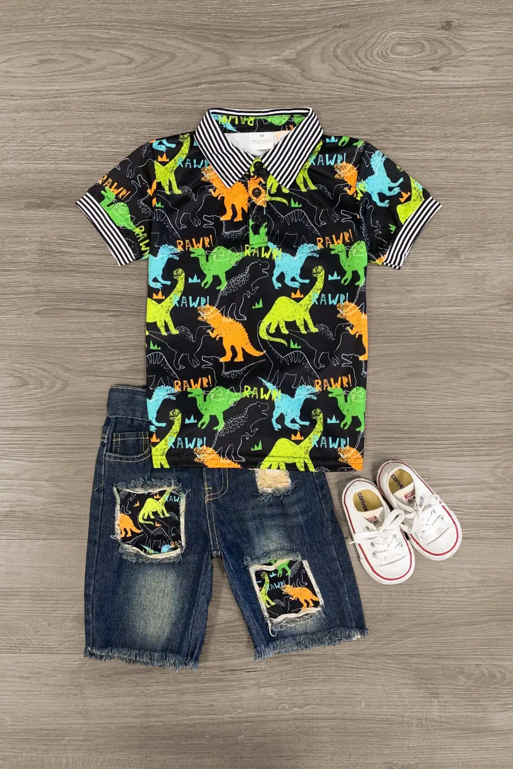 Bring on the warmer weather with this "Rawr!" Dinosaur Distressed Denim Short Set for boys. This polo style top features a fun dinosaur print with striped accents This top looks amazing paired with the matching distressed denim shorts. The adjustable waistband helps comfort and fit and can be great for on the go. He can mix and match these two pieces to create many handsome summer looks. Check out our for more outfits like this one!