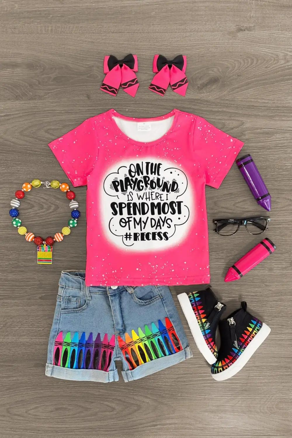 Add sweet fluttery style to her look with this "#Recess" Pink Crayon Denim Short Set. This girls' set is styled with a pink top that features "On The Playground Is Where I Spend Most Of My Days, #Recess" on the front, making it a staple addition to her classroom wear. The top is paired with matching denim shorts that feature a fun crayon design. The adjustable waistband provides a secure fit, and the ultra soft fabric provides all day comfort. She can pair this set with or our fun for the perfect look!