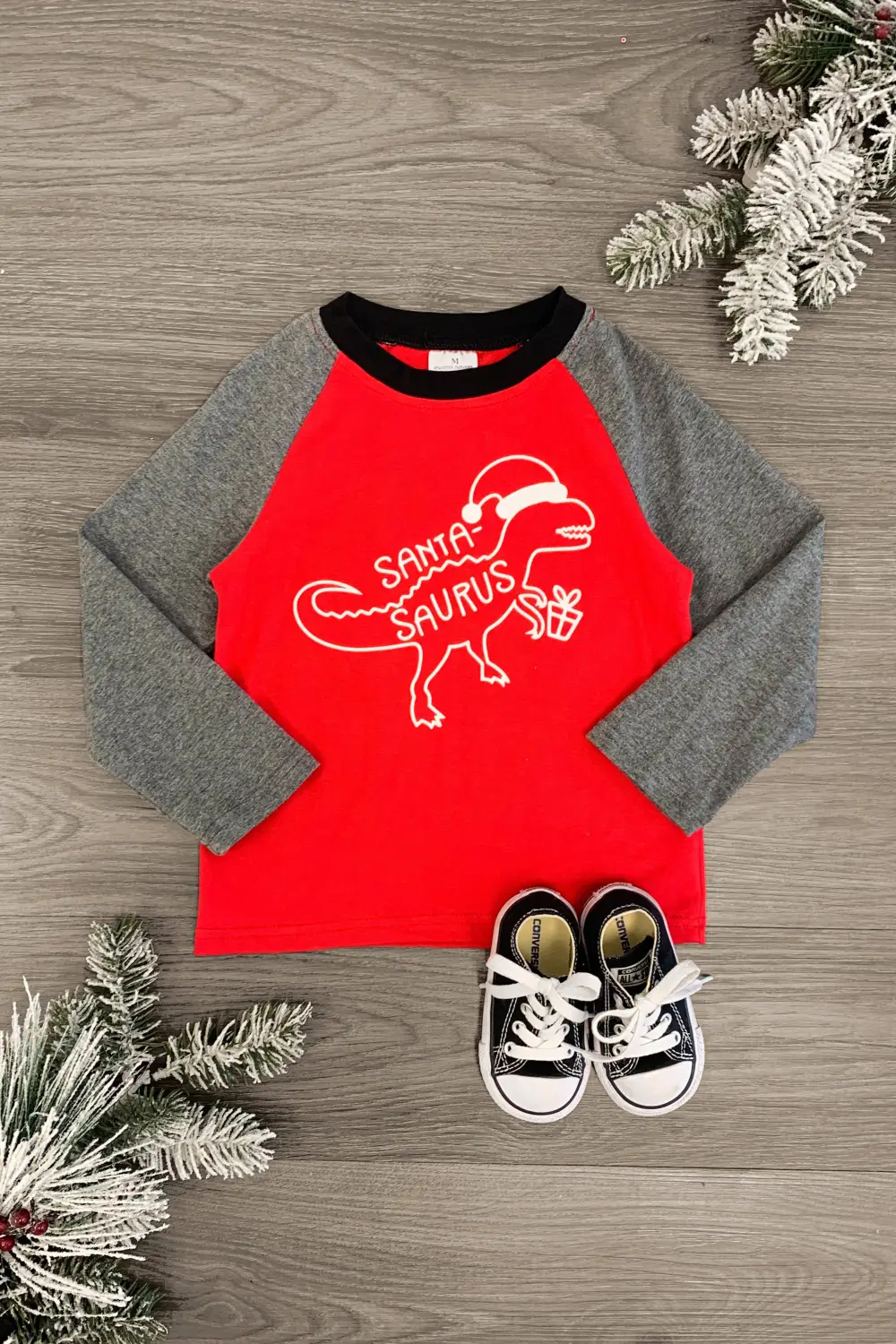This "Santa-Saurus" Red & Gray Top features long sleeves, and a festive dino design embossed on the front. In a fun red & gray design, this top is made from soft and breathable fabric that will keep your little one comfy during all adventures. They can pair it with a variety of bottoms for the perfect look! Check out our for more tops like this one!