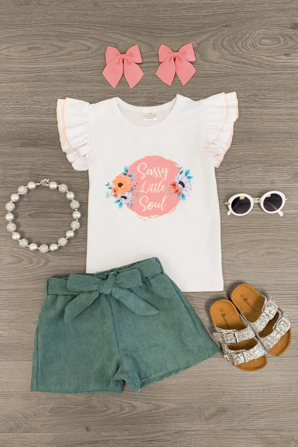Bring on the warmer weather with this "Sassy Little Soul" Ruffle Corduroy Short Set for girls. This top looks adorable paired with the matching teal corduroy shorts. The stretchy waistband helps comfort and fit and can be great for on the go, while the ruffle sleeves on the top keep your little one looking like a dream. The top and shorts can be worn as a set and paired with our or keep it laid back with a pair of , she’ll shine bright in this kids ensemble.