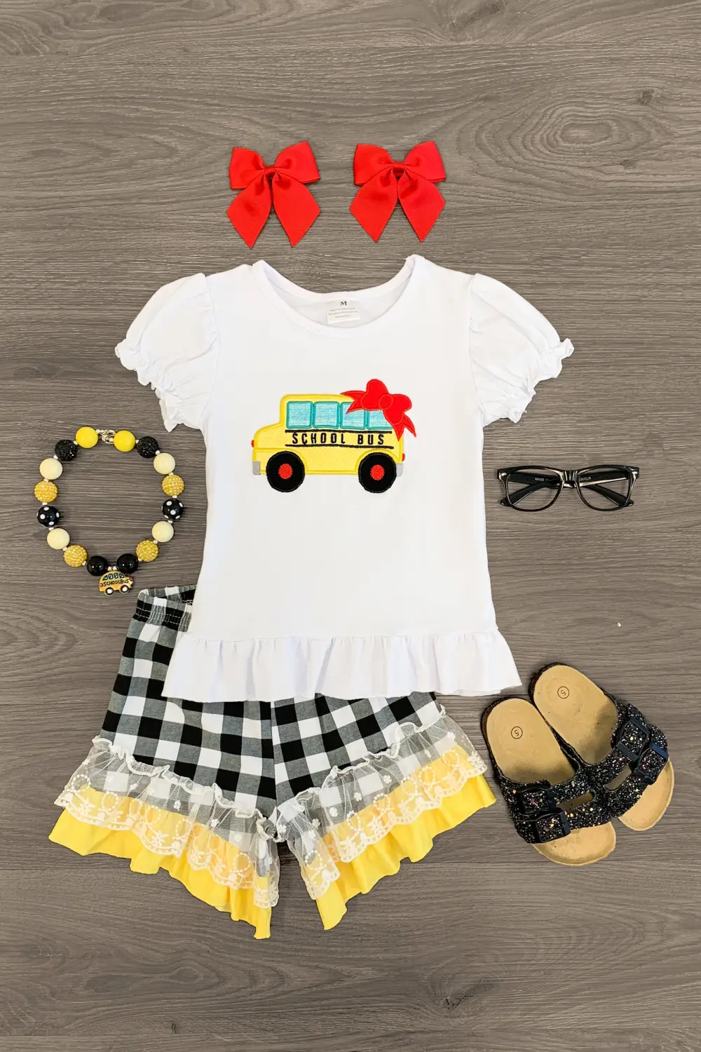 Bring on the warmer weather with this "School Bus" Gingham Ruffle Short Set. This short sleeve top features sweet ruffle details on the sleeves and hem for a touch of feminine style. This top is paired with matching gingham, yellow and lace ruffle shorts. The stretchy waistband helps comfort and fit and can be great for on the go. The top and shorts can be worn as a set and paired with our matching or keep it laid back with a pair of , she’ll shine bright in this kids ensemble.