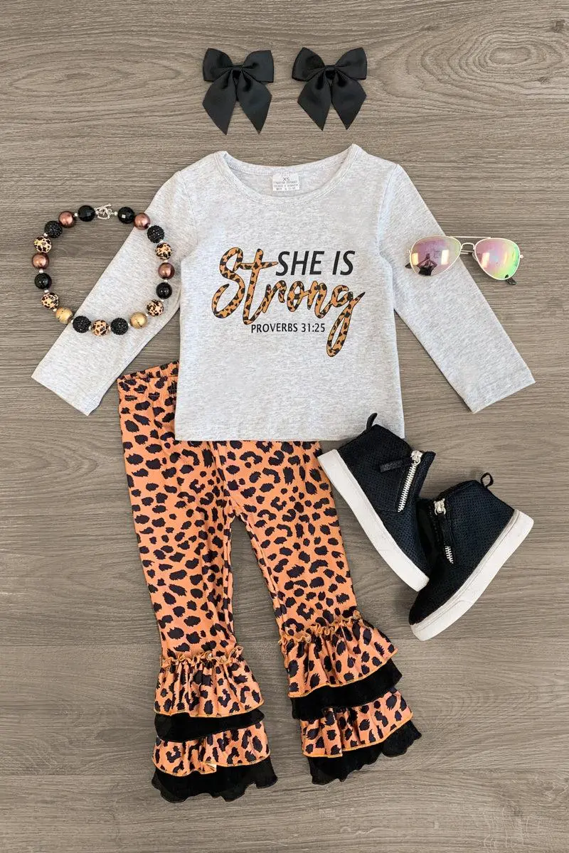 Bring on the cooler months with this "She Is Strong" Cheetah Ruffle Pant Set for girls! The long sleeve top features a cute saying on the front with a cheetah design, and looks adorable paired with the matching cheetah print ruffle bottoms. The stretchy waistband helps comfort and is great for all-day wear. The top and bottoms can be worn as a set with our matching , or keep it laid back with a cute , she’ll shine bright in this kids ensemble.