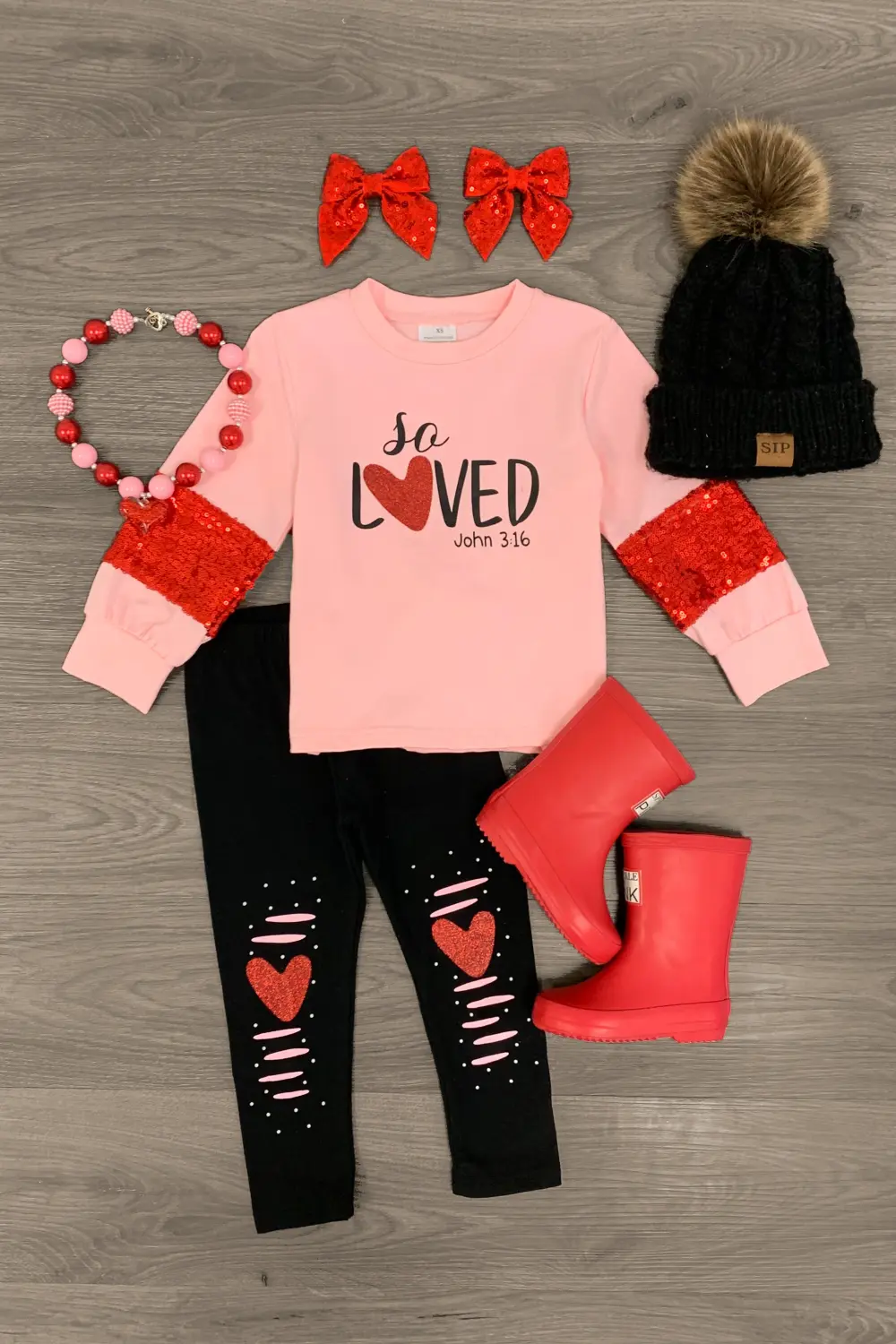 Your little love bug will look oh-so adorable in this "So Loved, John 3:16" Pink Legging Set for girls. This top looks adorable paired with the matching black leggings with printed distressed details. The top and bottoms can be worn as a set and paired with our matching or dress it up with a matching , she’ll shine bright in this kids ensemble.
