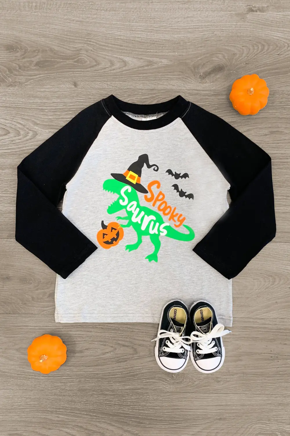 This Boys' "Spooky Saurus" T-Shirt features long sleeves, and a fun dino saying embossed on the front. In a fun gray and black design, this top is made from soft and breathable fabric that will keep your little one comfy during all adventures. They can pair it with our for the perfect look! Check out our for more items like this!