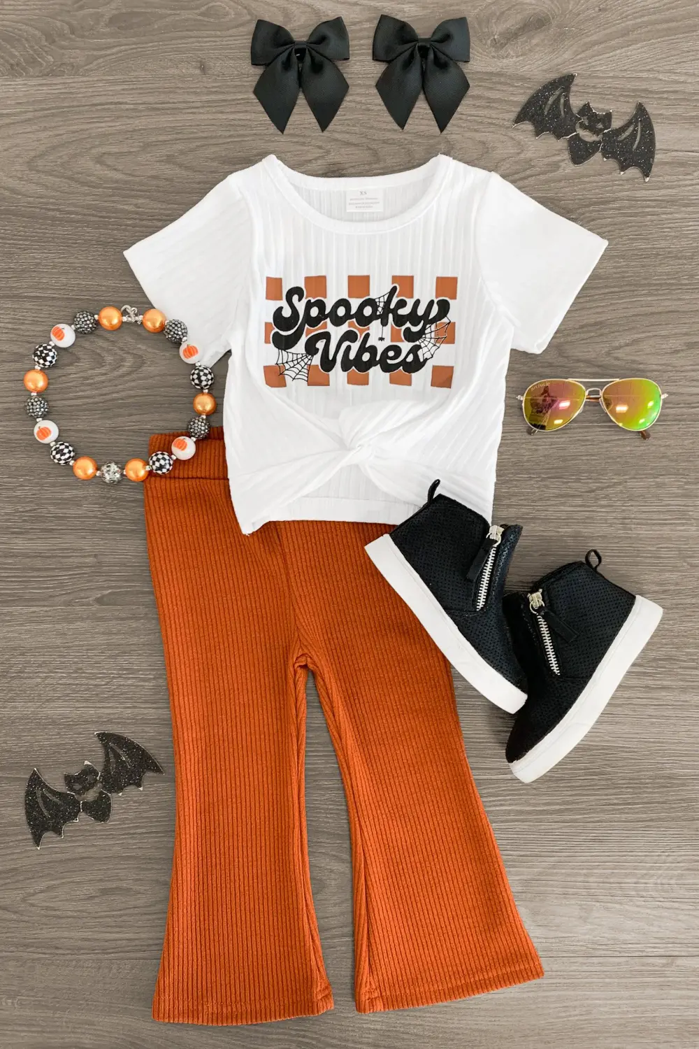 Add sweet spooky style to her look with this "Spooky Vibes" Rust Ribbed Flare Pant Set for girls. The white short sleeve top features a front tie design with a spooky design on the front and looks adorable paired with the matching rust pants. The adjustable waistband helps comfort and fit, while the ribbed flare design adds a fun touch. The top and pants can be worn as a set and paired with our matching or a matching for the perfect Halloween look!