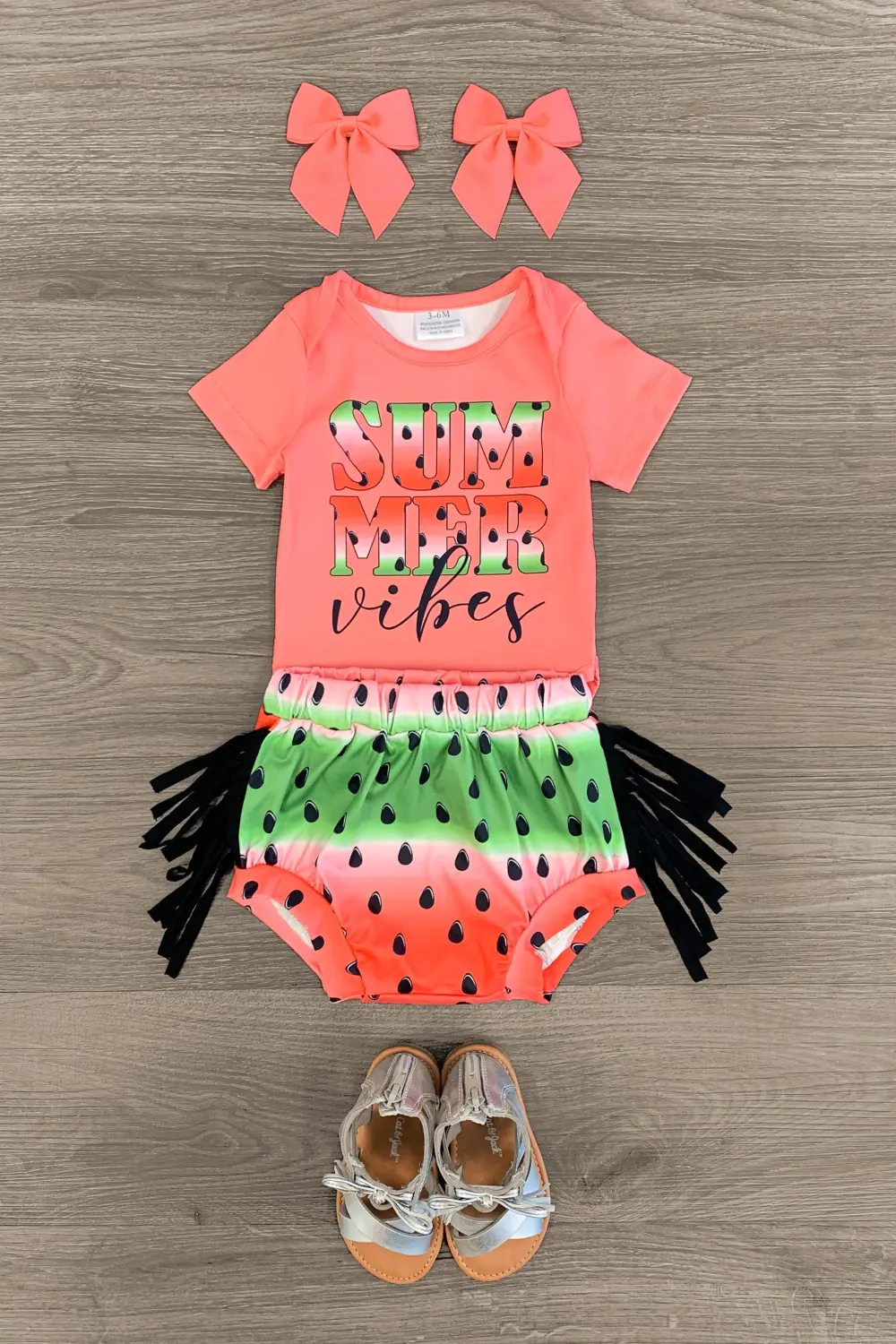 Dress up your little girl for the day in this "Summer Vibes" Watermelon Onesie Set for infants. This short sleeve onesie is made from soft & comfy fabric, making it a comfortable piece for warm weather wear. The bottoms feature a stretchy, elastic waist & fringe detailing for easy wear. Pair this set with a couple SIP for the perfect look. Check out our for more sets like this one!