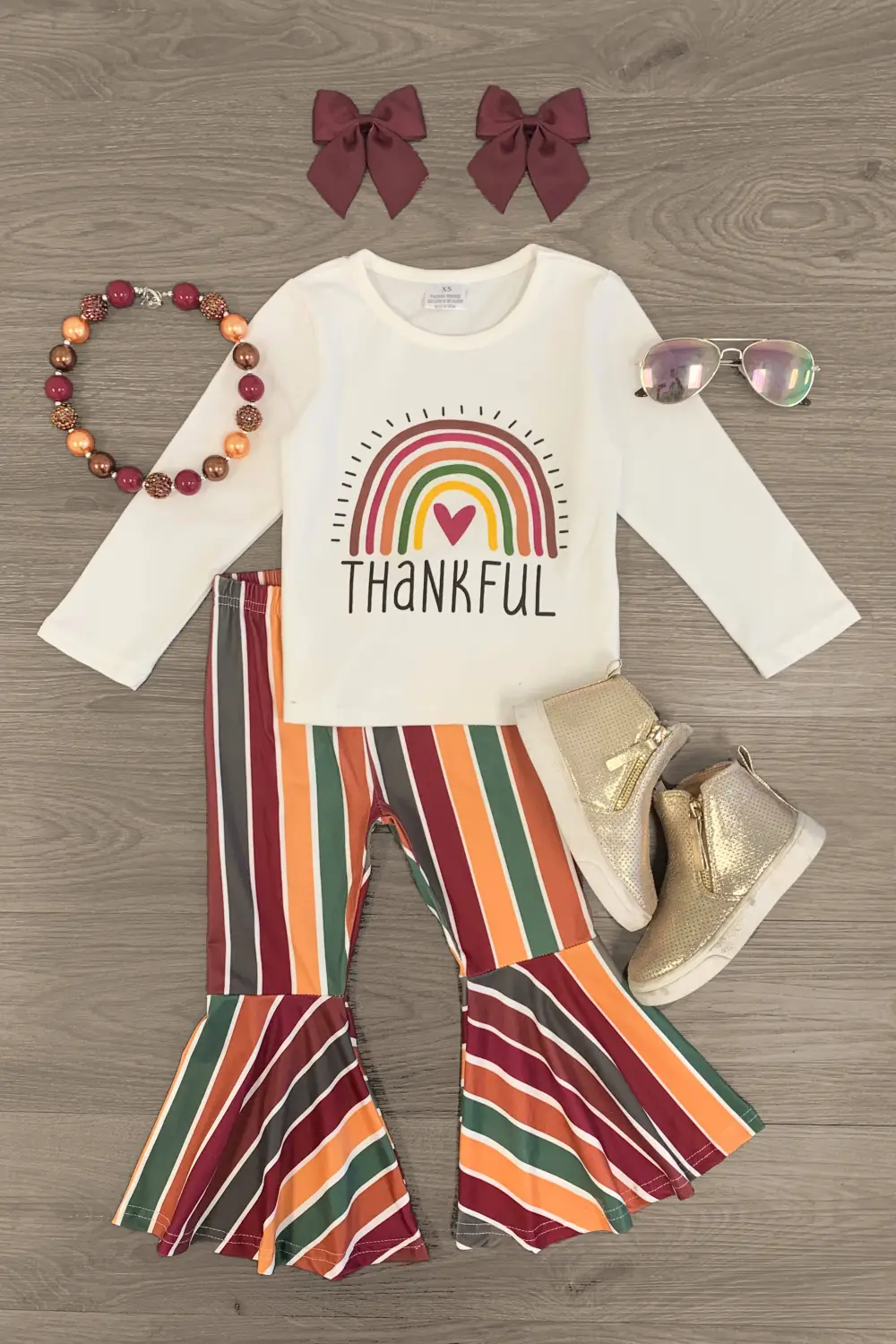 Bring on fall with this "Thankful" Rainbow Doodle Striped Bell-Bottom Set. This white long sleeve top features a cute rainbow and "Thankful" embossed on the front. The rainbow design matches the colorful rainbow bell-bottom pants. This look is versatile and great to be worn together as a set or paired with other looks. Pair this look with our matching Orange Plaid or complete the ensemble with any one of our SIP Kids'