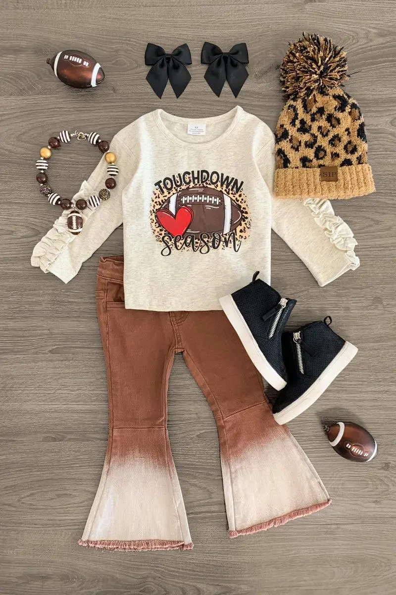 Bring on the cooler days with this "Touchdown Season" Denim Flare Set for girls. This long sleeve top features a cute football design on the front with ruffle detailing. This top looks adorable paired with the matching brown ombré flare jeans. The adjustable waistband helps comfort and fit and can be great for on the go. The top and pants can be worn as a set and paired with our SIP or keep it laid back with a cheetah , she’ll shine bright in this kids ensemble.