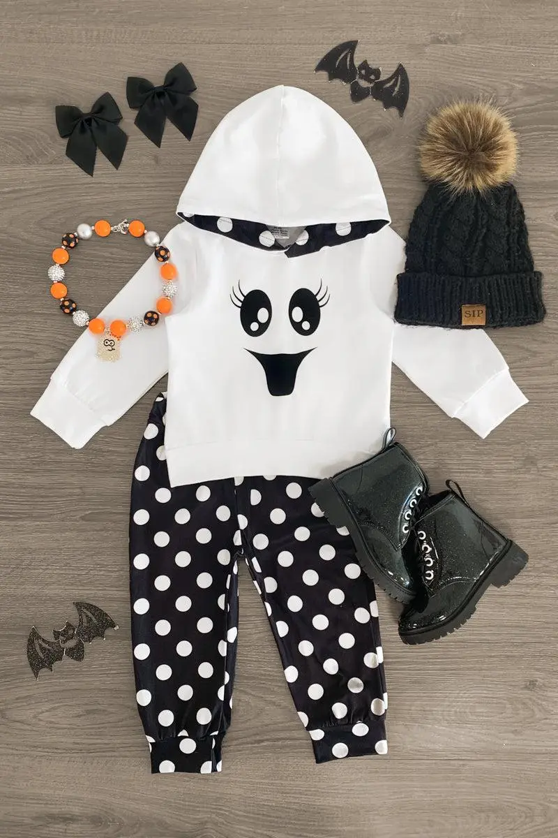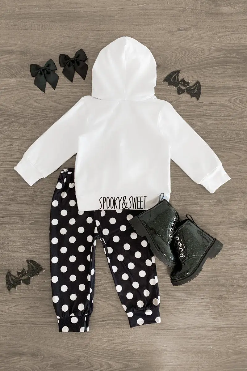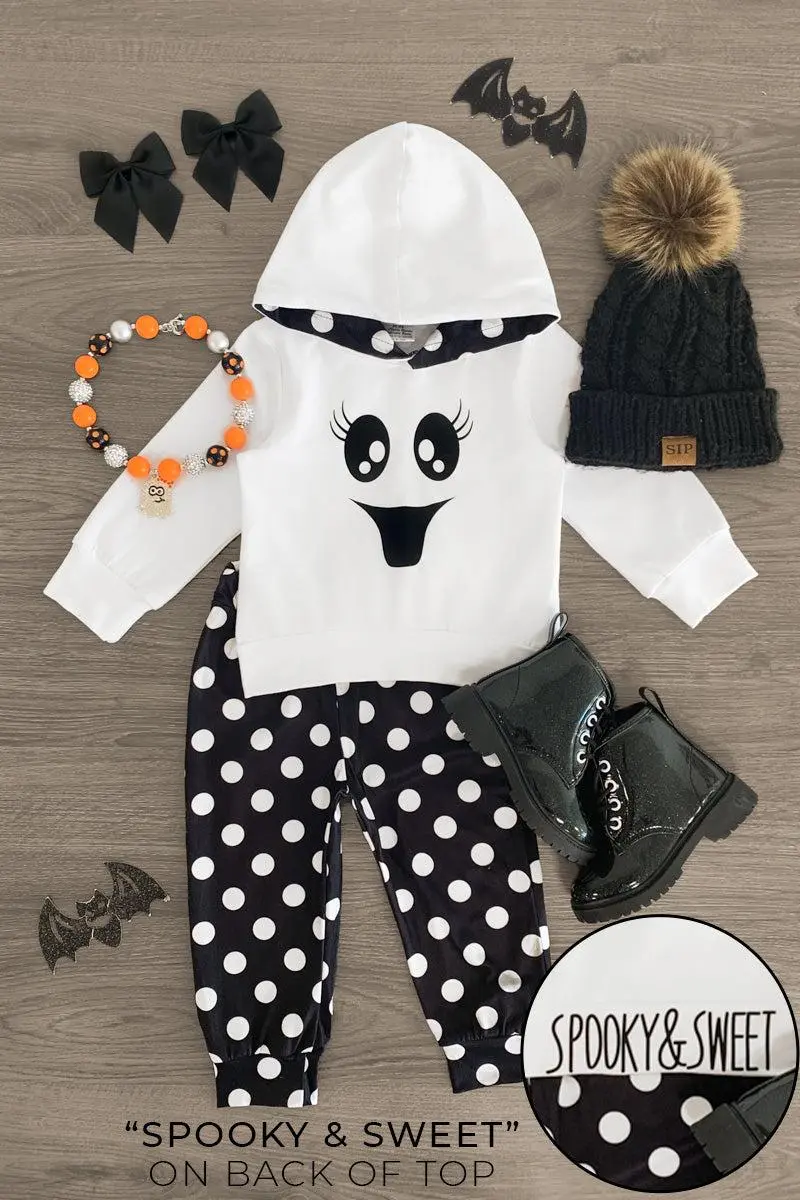 Add spooky style to your little boo's wardrobe with our "Spooky & Sweet" Ghost Hoodie Pant Set. This girls' set is styled with a white hoodie embossed with a ghost face on the front and "Spooky & Sweet" on the back, making it perfect for the Halloween season. The hoodie looks adorable with the matching black and white polka dot leggings. She can pair this outfit with or a matching for the perfect spooky look!