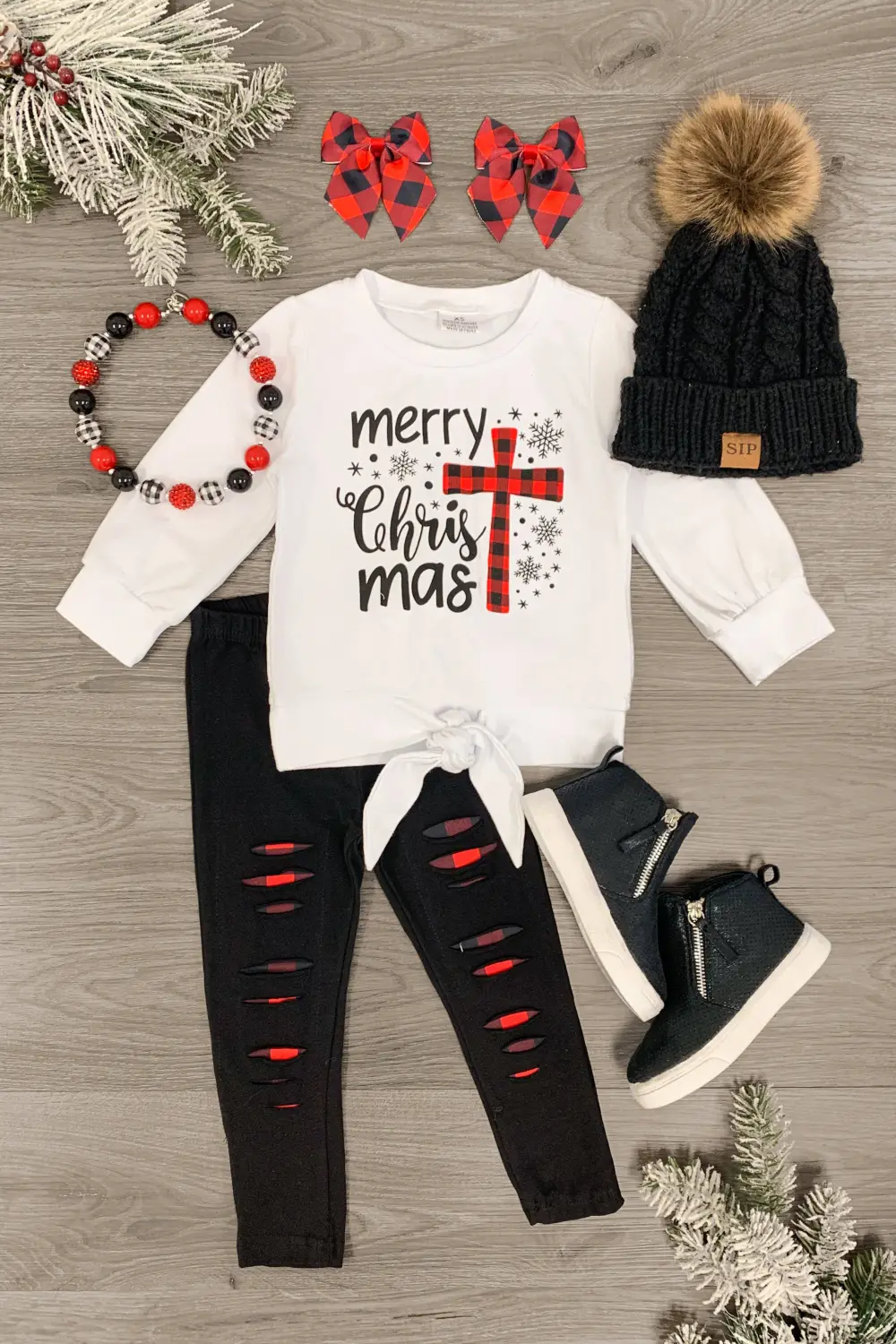 Bring on the holiday season with this "Merry Christmas" White Legging Set for girls. This white tie top looks adorable paired with the matching black leggings. The stretchy waistband helps comfort and fit and can be great for on the go, while the "Merry Christmas" cross design adds the perfect festive touch. The top and pants can be worn as a set and paired with our matching or keep it laid back with a pair of , she’ll shine bright in this kids ensemble.