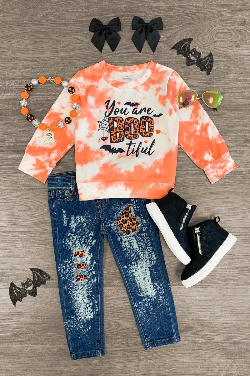 Bring on spooky season with this "You Are Bootiful" Orange Denim Pant Set for girls. This orange tie dye top features a cute saying on the front. This top is paired with distressed denim jeans with peekaboo cheetah details. The adjustable waistband helps comfort and fit and can be great for on the go. The top and pants can be worn as a set and paired with our SIP or keep it laid back with a pair of , she’ll shine bright in this kids ensemble.